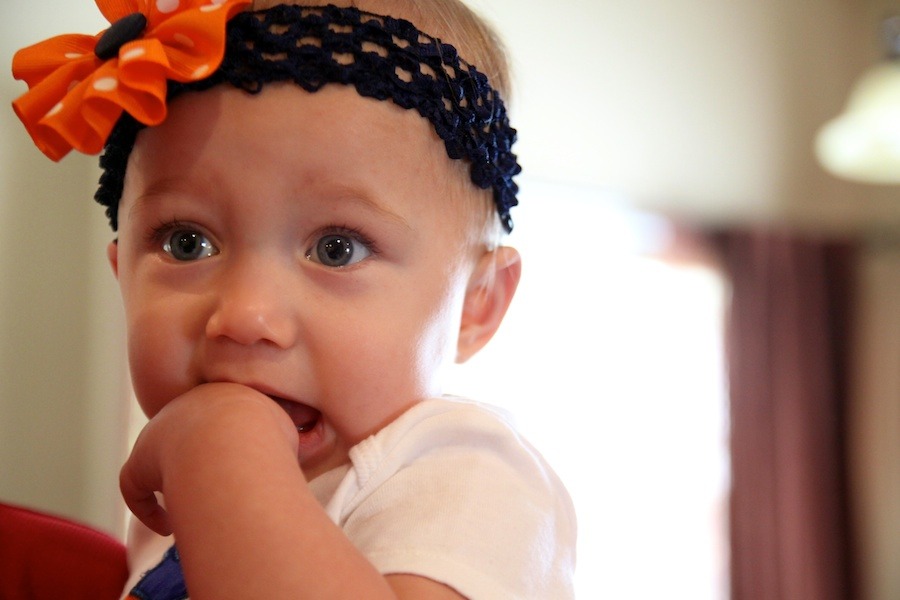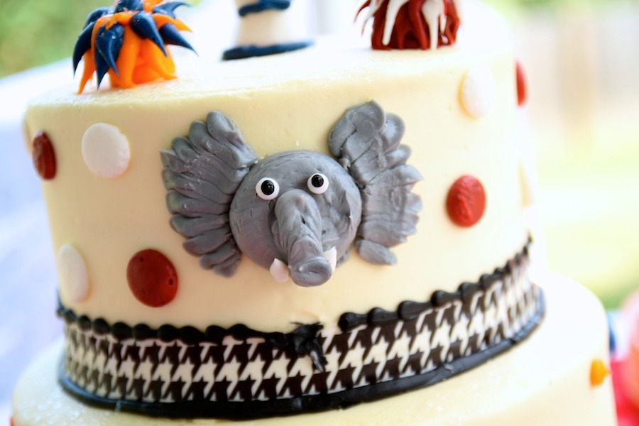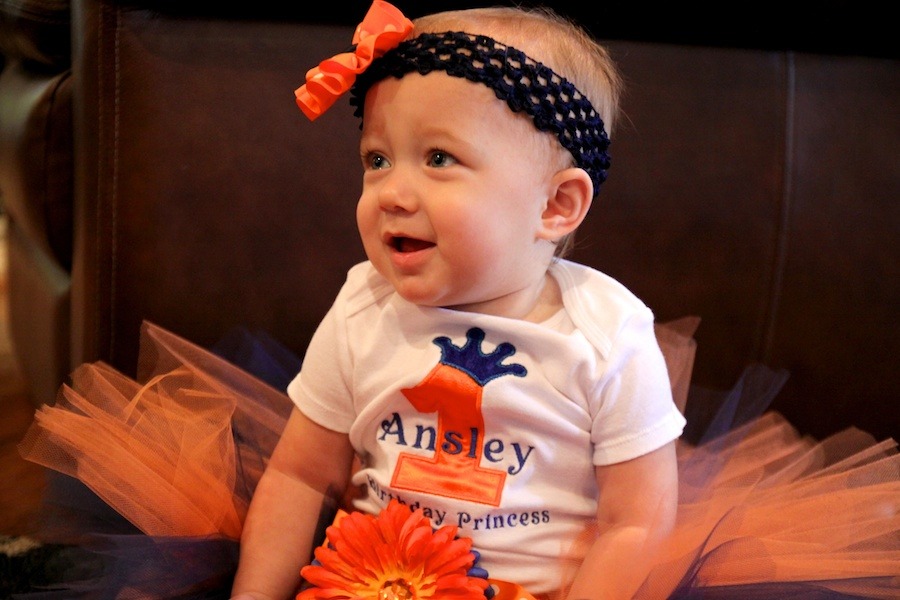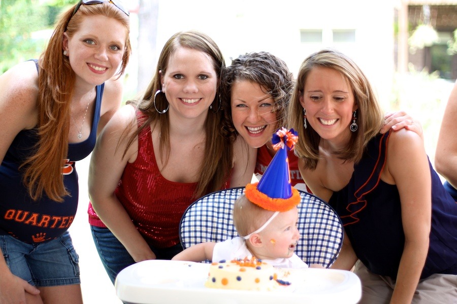 It’s only fitting that my best friend gave birth on this weekend last year. She and her husband are huge football fans and they are “A House Divided” – which, in football-speak, means one is an Alabama fan and one is an Auburn fan! They had a baby girl (who by default is an Auburn fan because mom has ultimate power) and thus began the never-ending attempts to get her to say “Roll Tide” and “War Eagle,” to put her in something crimson when mom isn’t looking, and the inevitable jokes about when she gets old enough to really “choose” for herself. But having a baby on the opening weekend of college football essentially means that her birthday parties will always include football in some capacity. So her first birthday party was, of course, Alabama/Auburn themed. Lindsay and Ryan pulled out all the stops and threw an awesome shindig. They rented a projection screen TV for the Bama game and had another large screen for the Auburn game, they catered fun tailgate food, rented a moon bounce for the kiddos, iced down tubs of beer for the adults and Capri Sun’s for the little ones, and decorated to the hilt in everything crimson and white, orange and blue that they could get their hands on. It was an AWESOME party!! And oh dear god how much do I love that Ansley Dean Miller!!!! Words can’t express how excited I am to watch her grow up…and how much I’m going to learn from her amazing parents when I have my own kids. See pictures from the party below.