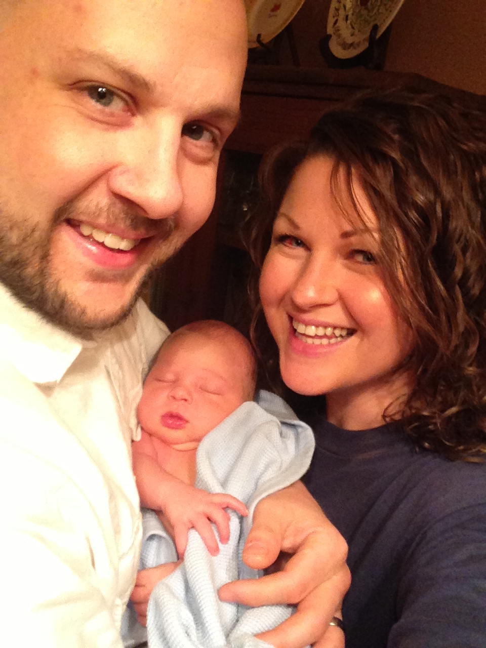 Finally Kelly suggested someone get a towel. One of the nurses held both ends of the towel and I held the loop. When it was time to push I would pull on the loop and they would pull on the ends. Having something to grip and bear down on made the pushing a bit more effective. Eric, Kelly, and the nurses took turns holding the ends of the towel. I don’t know how but they say I was so strong that I was pulling them into the table. They kept having to switch off because they were tiring out. I don’t know how I did it. Even with the towel to hold on to, I was still giving out and getting weaker by the last push and couldn’t keep the momentum. Then they brought in the big mirror on wheels. They put that big thing at the end of the bed and angled it towards my vagina. When I was able to see his head and see how close he was to coming out, it gave me the little boost I needed to finish pushing him out. I have never done anything so hard in my life. I was so weak I could barely hold him once he was out. Eric and I were both bawling. He was so perfect and we were so relieved that it was over and he was here and he was healthy!!!