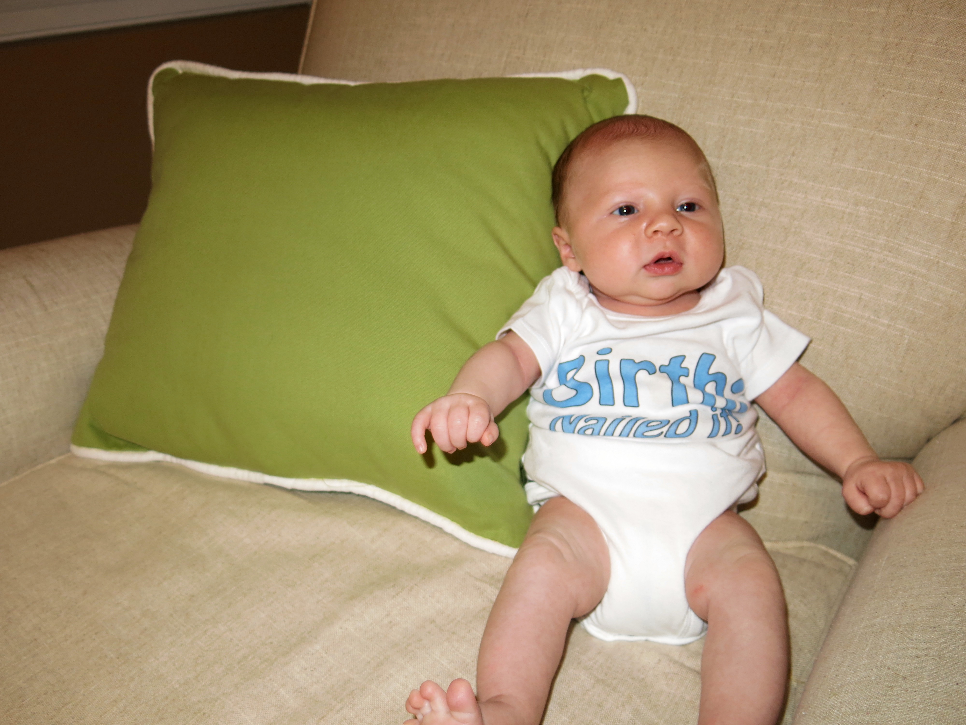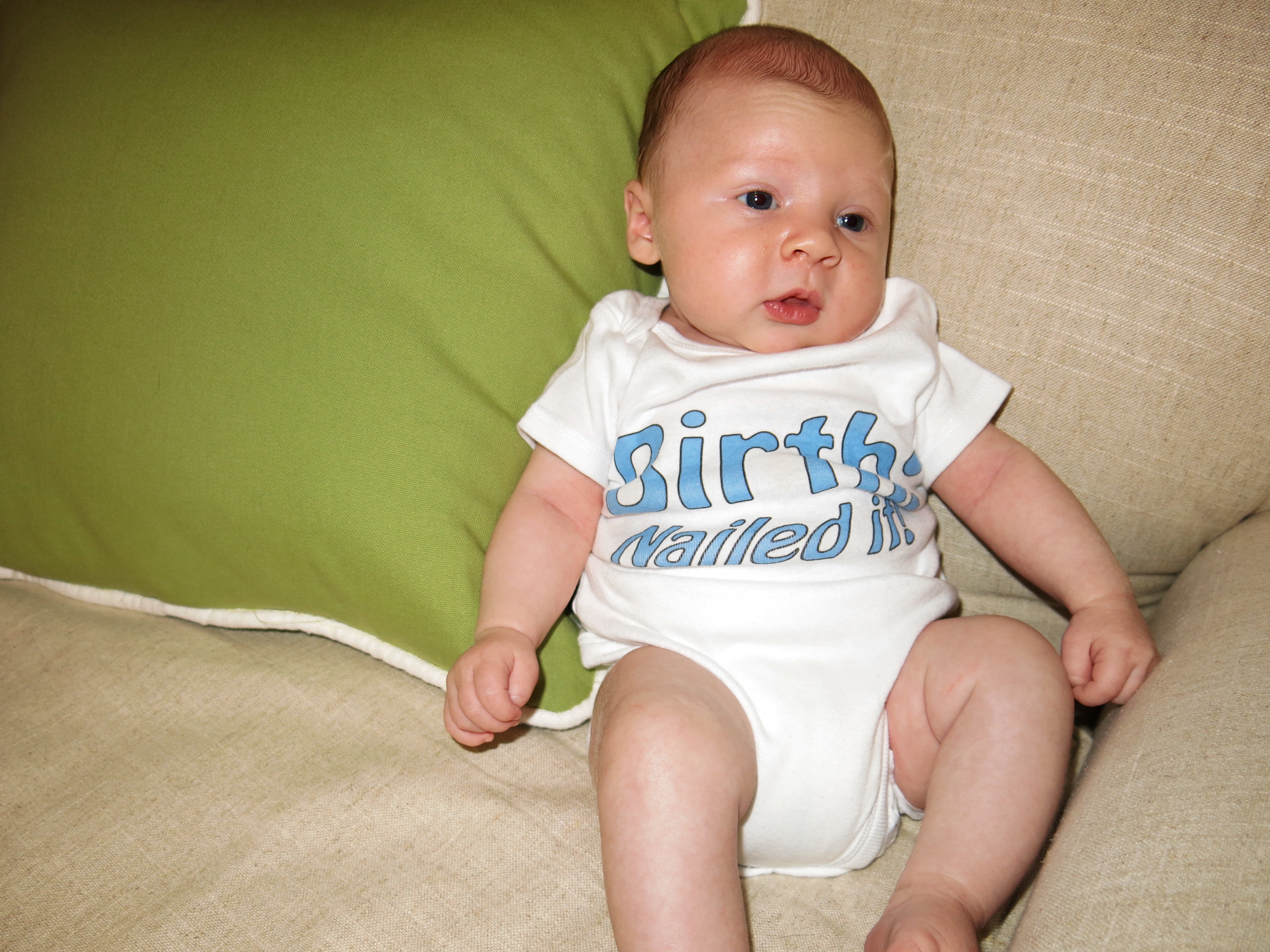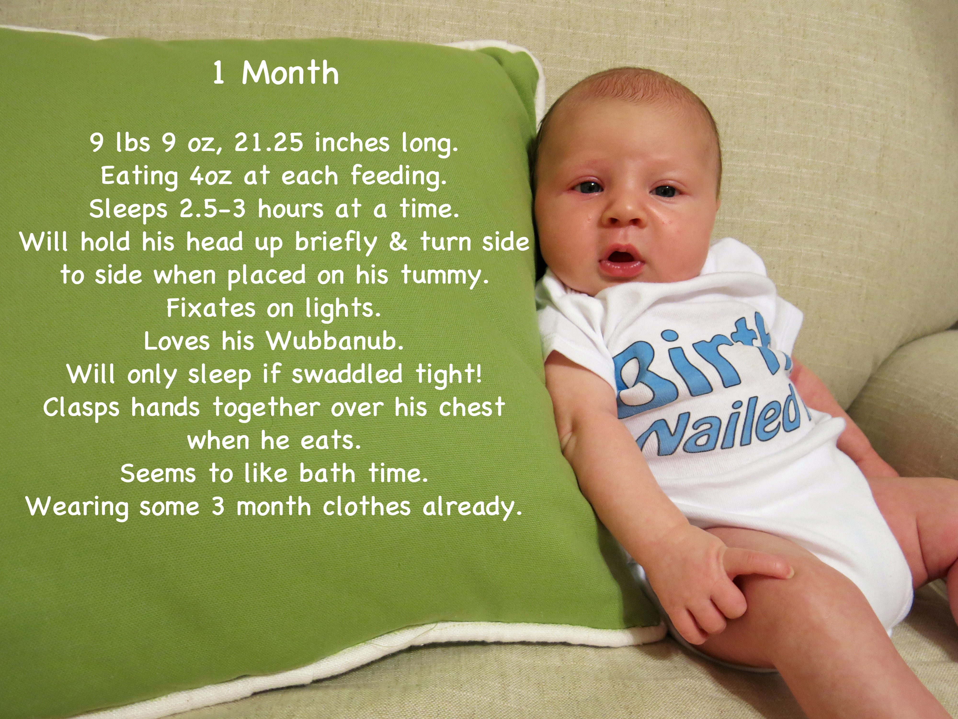 For that stats:  I decided to do monthly pics for his first year like I did my belly pics through my pregnancy!  Here’s our first one…and a few of the cute outtakes while we were trying to get a good one!  I decided to put him in his “Birth: Nailed It” onesie because… we totally did!