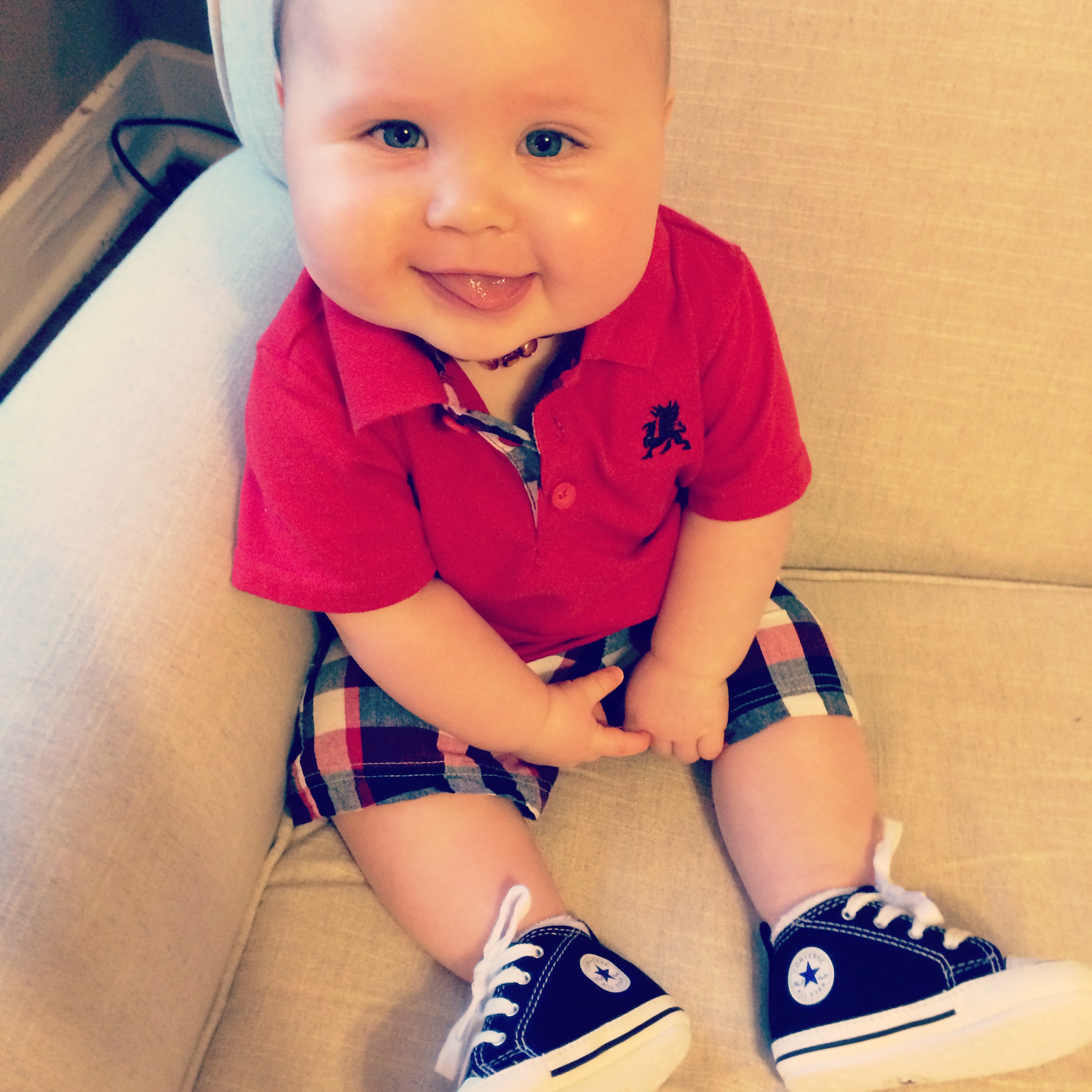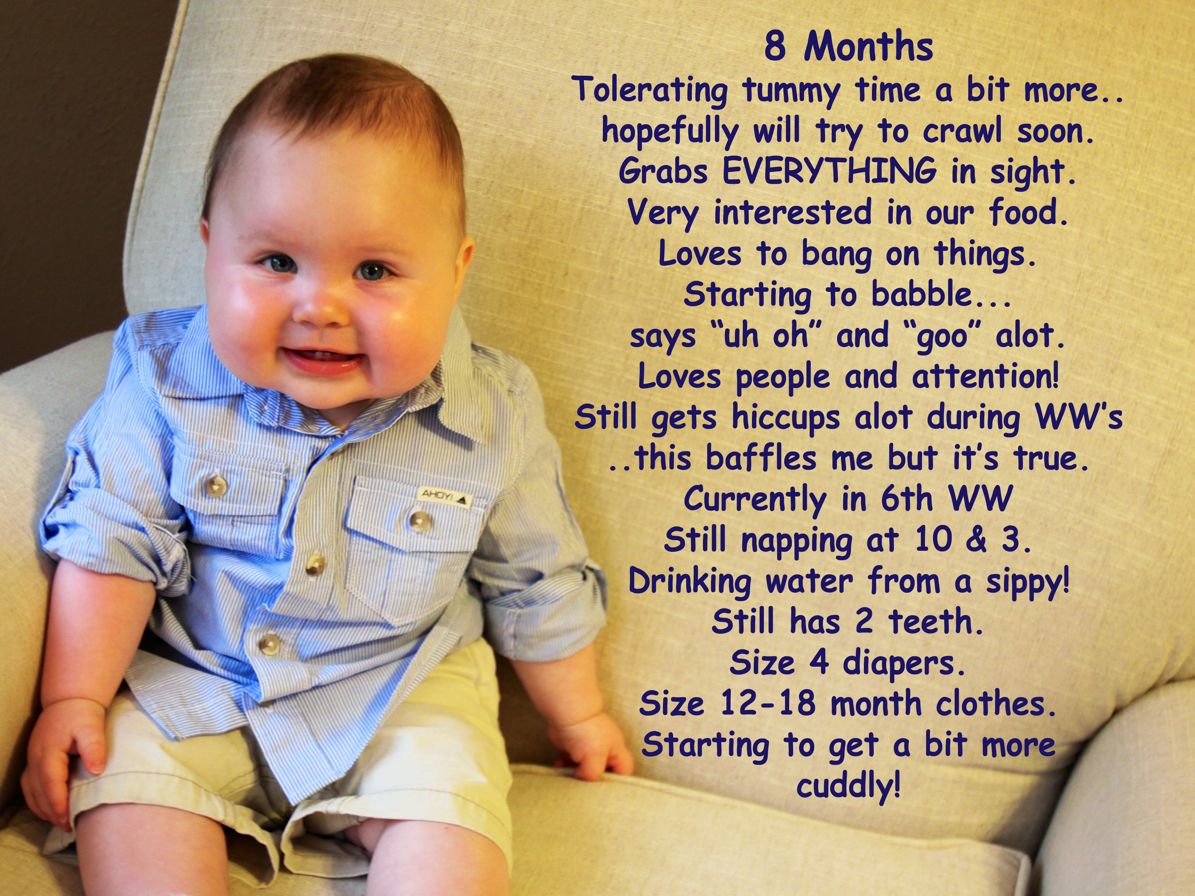 I am ashamed this post is so late and is going to be so brief.  There’s not a ton to report at our 8 month update.  Ritter still isn’t showing any interest in crawling and still hates being on his tummy.  He will tolerate it a little bit if he falls onto his tummy when reaching for something, but after a few minutes will flip himself back over.  He isn’t pulling up or trying to crawl.  He does a funny little swimming motion on his belly and tries to scoot but doesn’t really get anywhere.  I’m trying not to compare him to other babies as I know the developmental stuff is different for all of them.  And he’s HUGE.  He hasn’t been weighed in a couple of months but given my recent trip to the chiropractor for my crazy back/neck issues from lifting him, I’d say he’s pushing 30 pounds.  He seems to be much much longer too.  Maybe he’ll be tall like my daddy and my brother.  He may not be blazing up the charts developmentally but intellectually I think he’s gonna be a smartie pants.  Just the little things he does and picks up on is crazy.  He inspects everything and seems interested in everything and we are constantly telling him what everything is and saying words over and over.  He has started uttering “Uh Oh!!” all the time and it’s so cute.  I say it alot when he drops his paci so he’s obviously picked it up.  We say “love you” alot to him and he’s started babbling something like the vowel sounds “uv ew” and it’s ADORABLE! He’s drinking water from a sippy cup now and tries to hold it himself and it’s so cute..he just doesn’t get the fact that he has to turn it up.  He bends down and puts his mouth on it and sucks and nothing comes out.  I see lots of babies holding their own bottles at his age – not Ritter.  He is totally content to let you do that work for him.  ha.