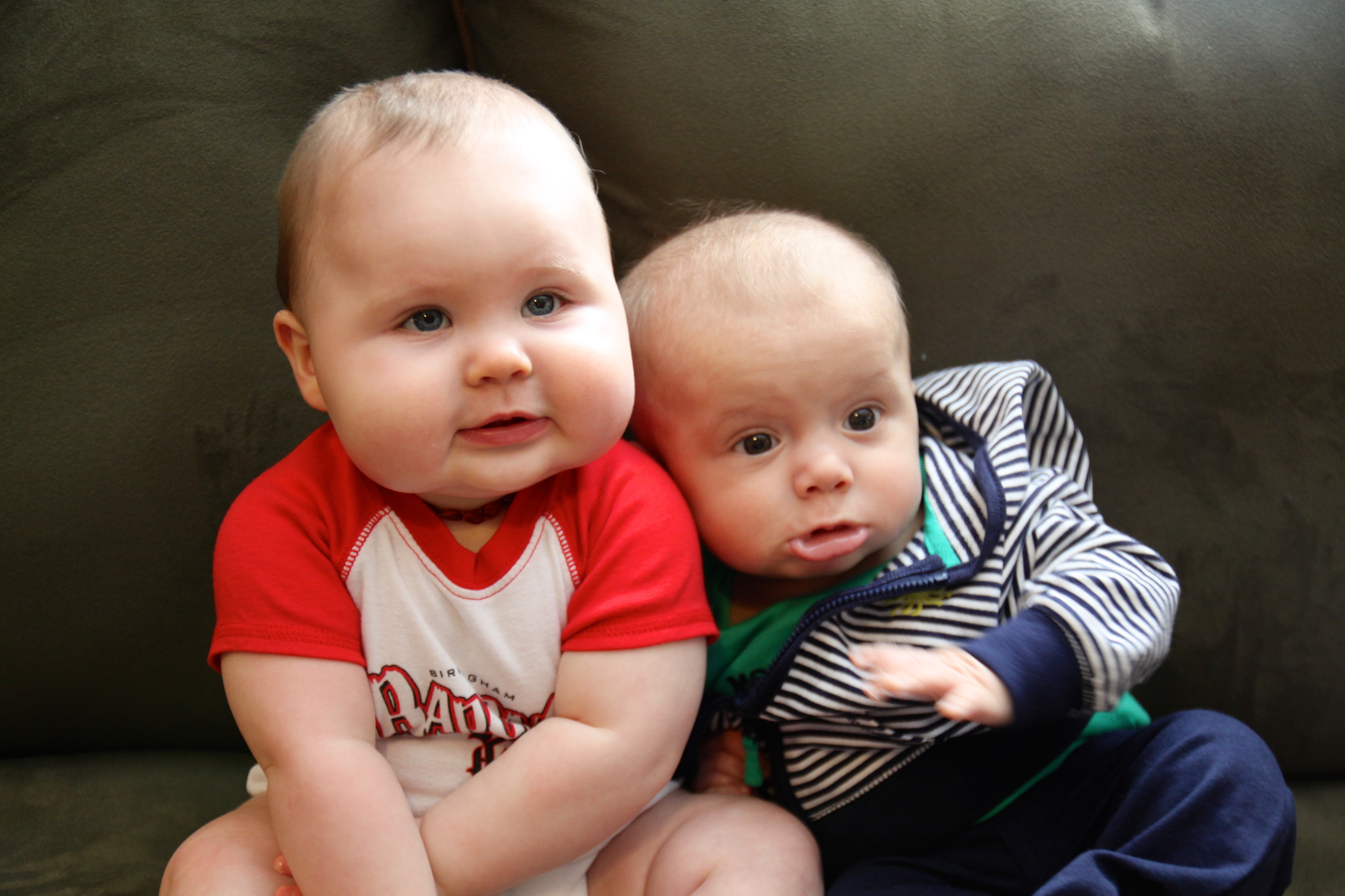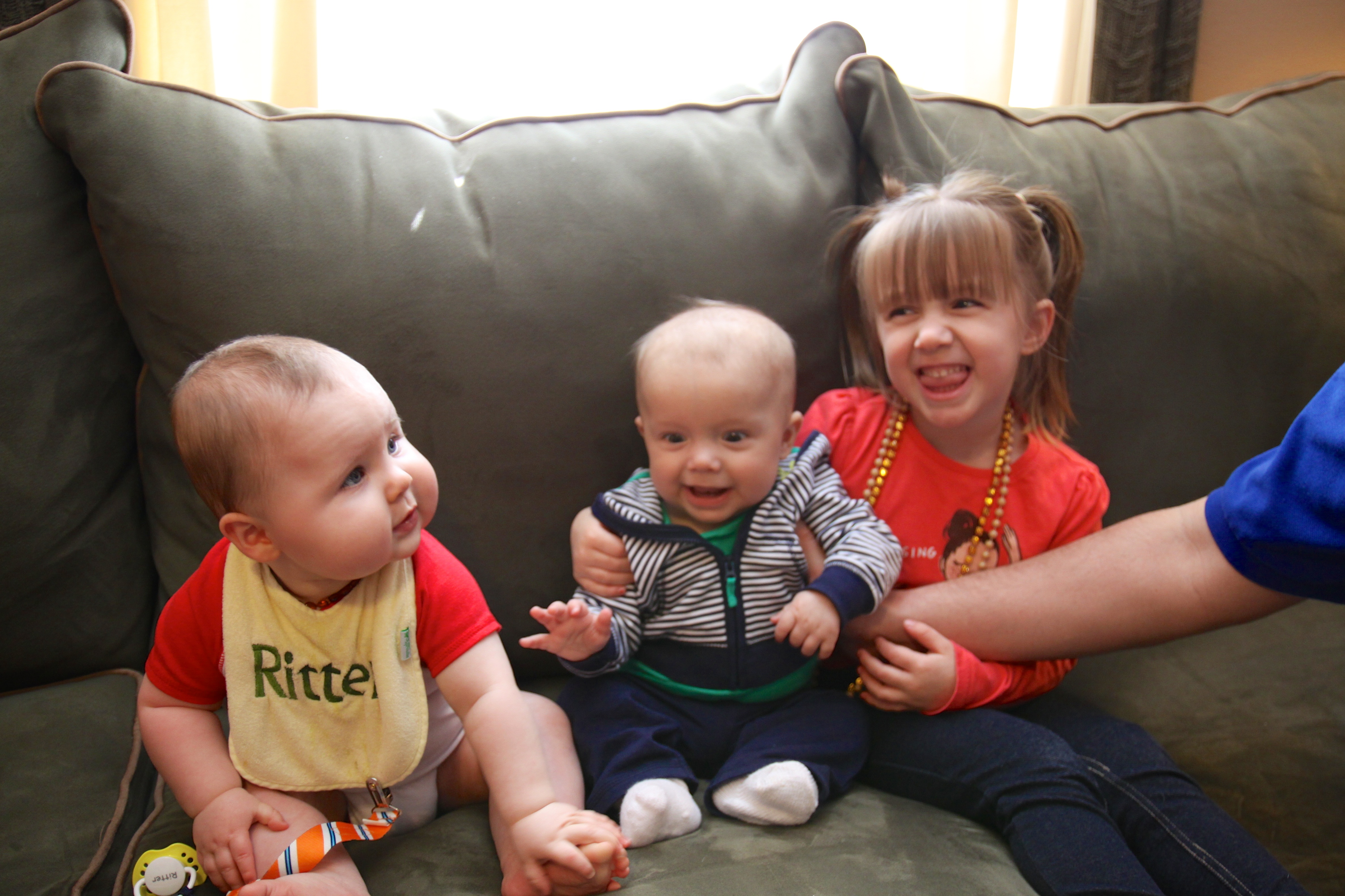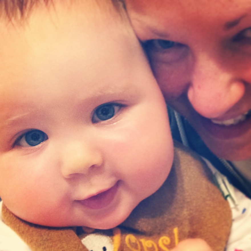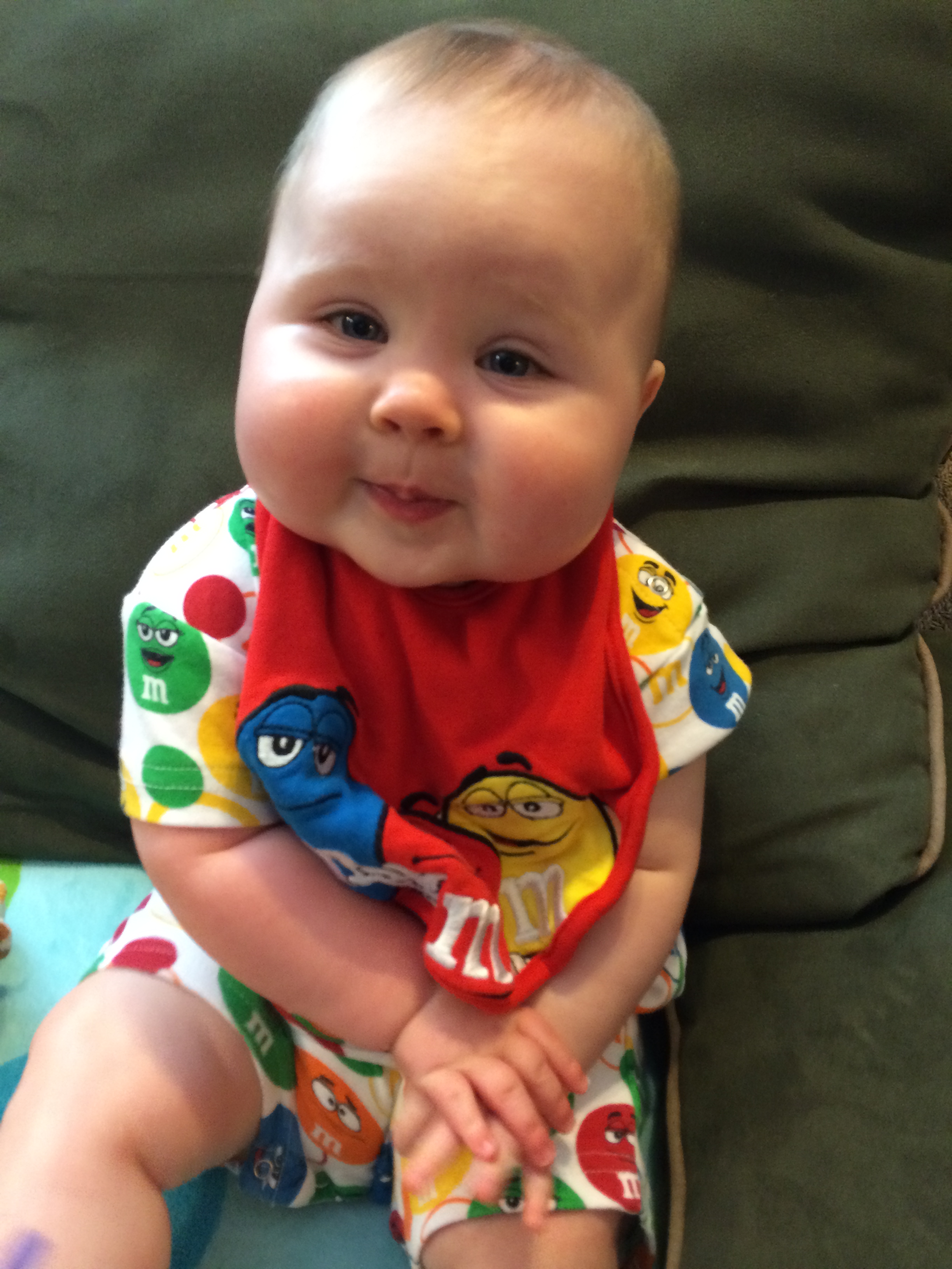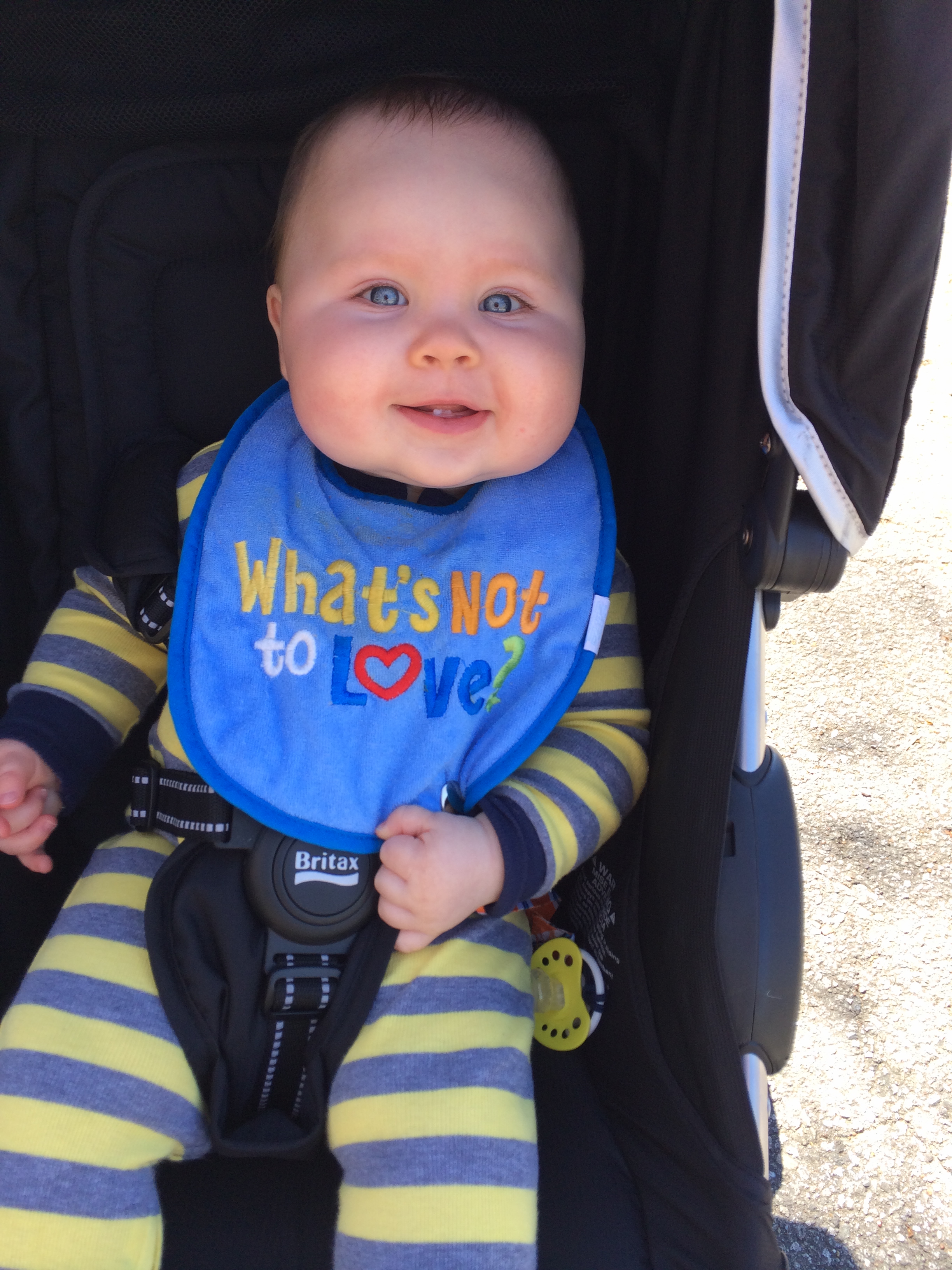He’s still super chill and loves people.  He’s been going through the 6th mental leap (see Wonder Weeks) over the last few weeks.  It hasn’t been HORRIBLE like some in the past but it’s had its moments.  He’s still sleeping through the night great, however he has been waking up exactly 1 hour earlier for about 3 weeks now and nothing we do makes him go back to sleeping til 7:30.  He wakes up at 6:30 like clockwork.  The book says they will wake early during this leap so we are trying to ride it out – but I miss sleeping til 7:30-7:45 on the weekends.  He’s not waking up unhappy, he’s just in there awake…usually playing with his lovie and cooing.  I was freaked out at first that it would throw off the rest of the schedule but naps have been okay.  The biggest thing we’ve noticed about this one is the fussiness.  It’s not all the time but he’s much more demanding than usual.  If we are out and about he’s still super chill but at home he needs constant entertainment or he’s squealing at the top of his lungs.