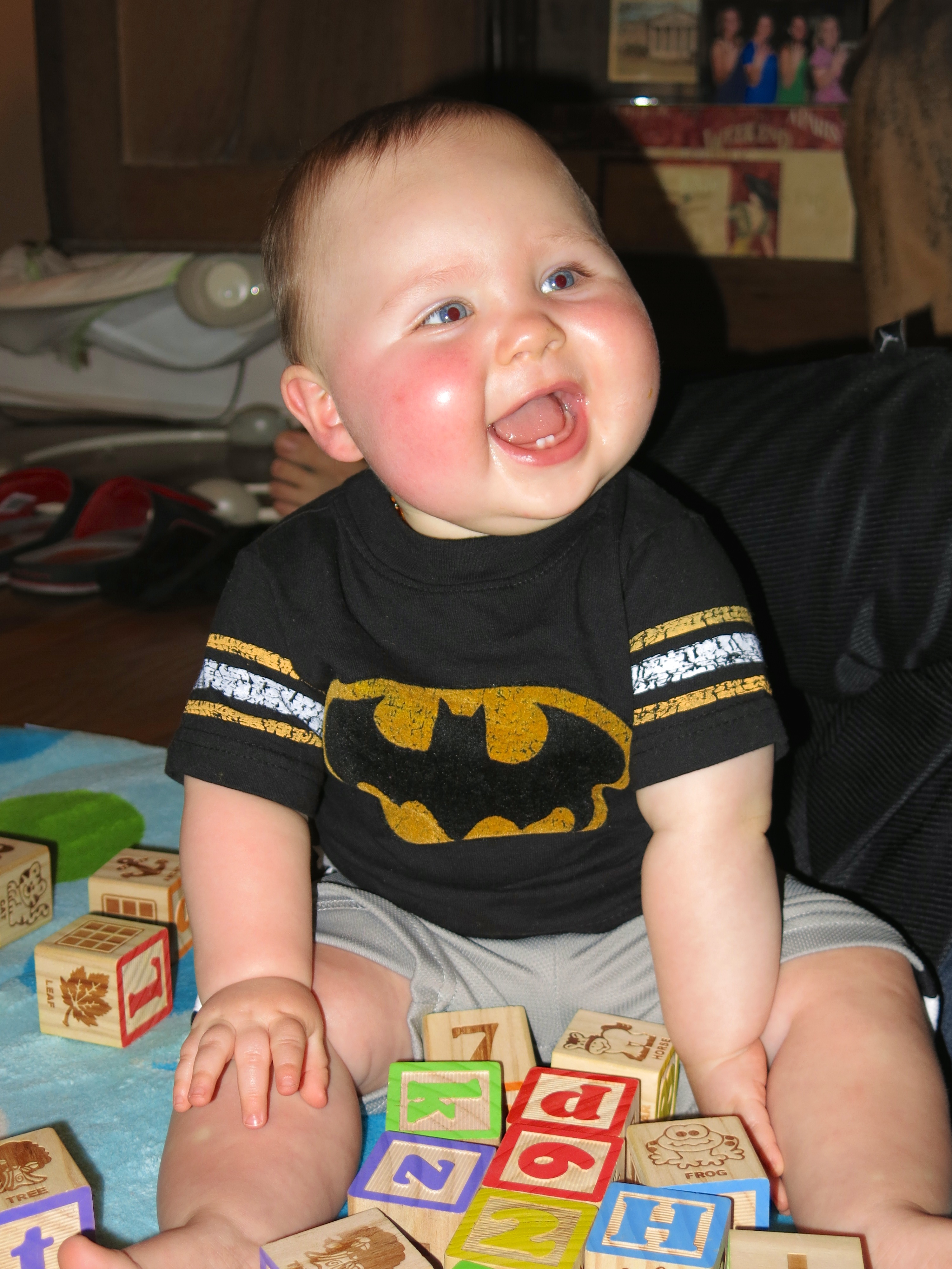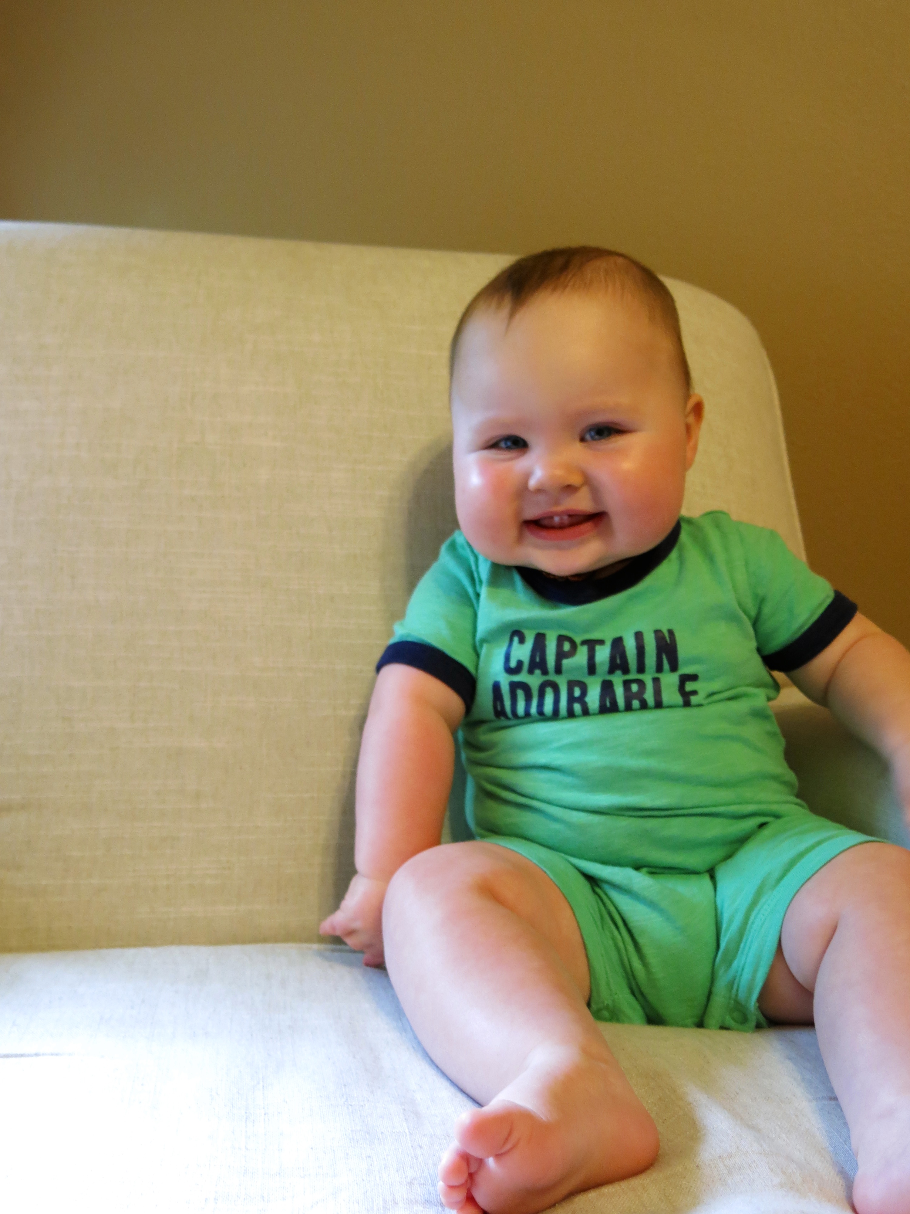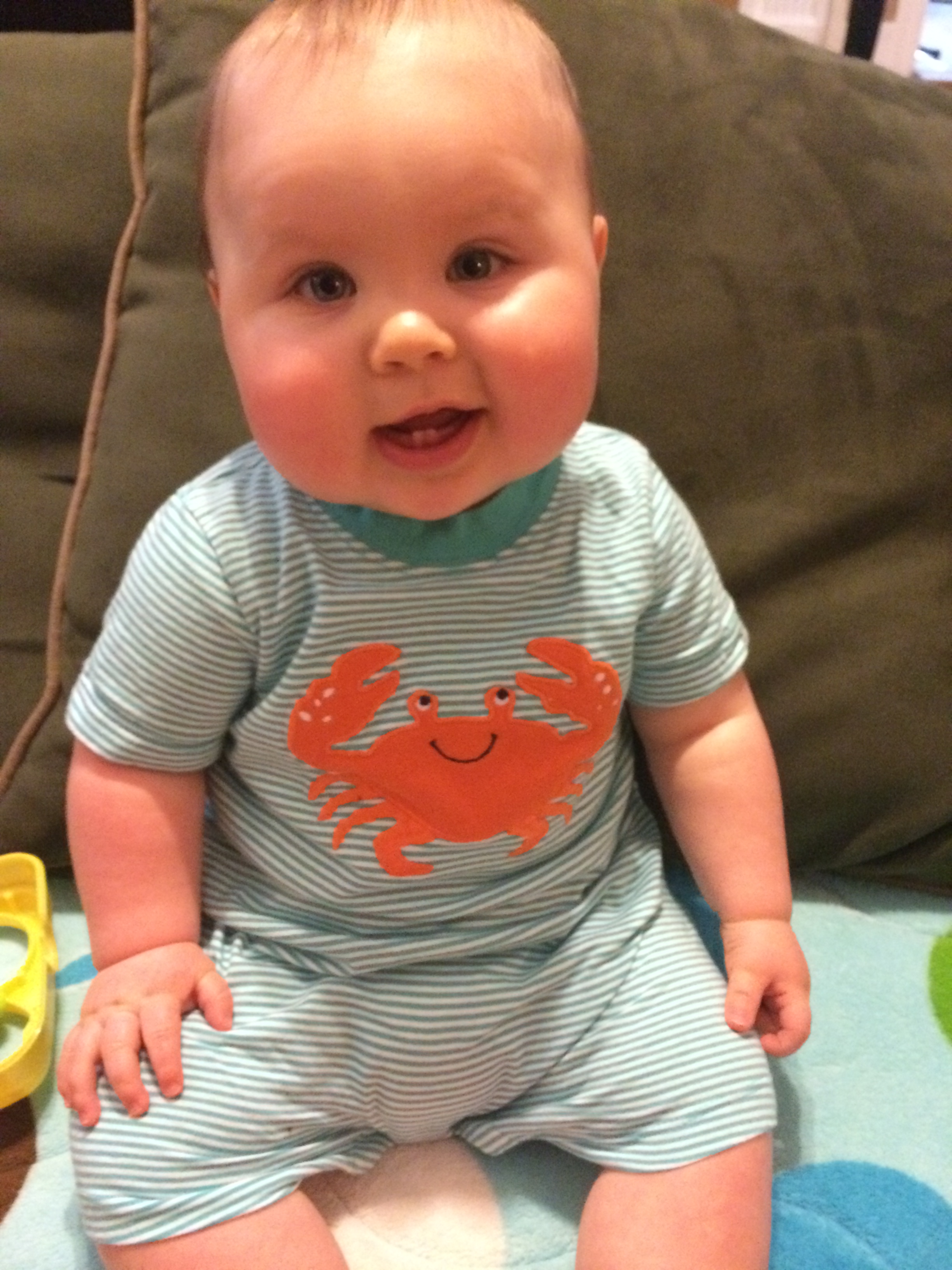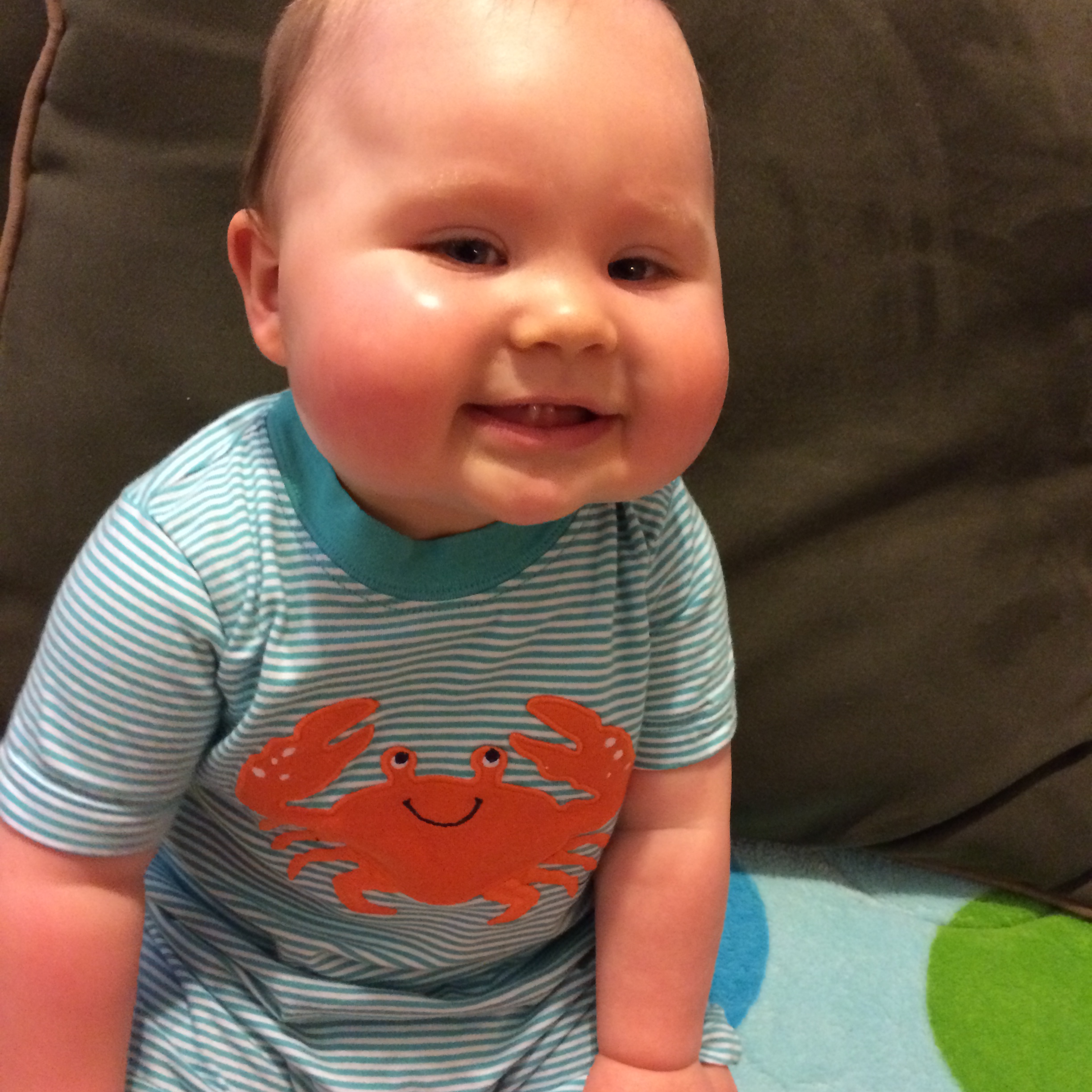 - Rolls both ways with ease. Is more motivated to be on his tummy now. Will roll over and over until he rolls off of the play mat. He’s also way less cautious. If he’s sitting up and sees something out of reach he will throw himself over – even though he can’t crawl and will roll around until he reaches it. He’s trying to scoot but isn’t successful really yet.