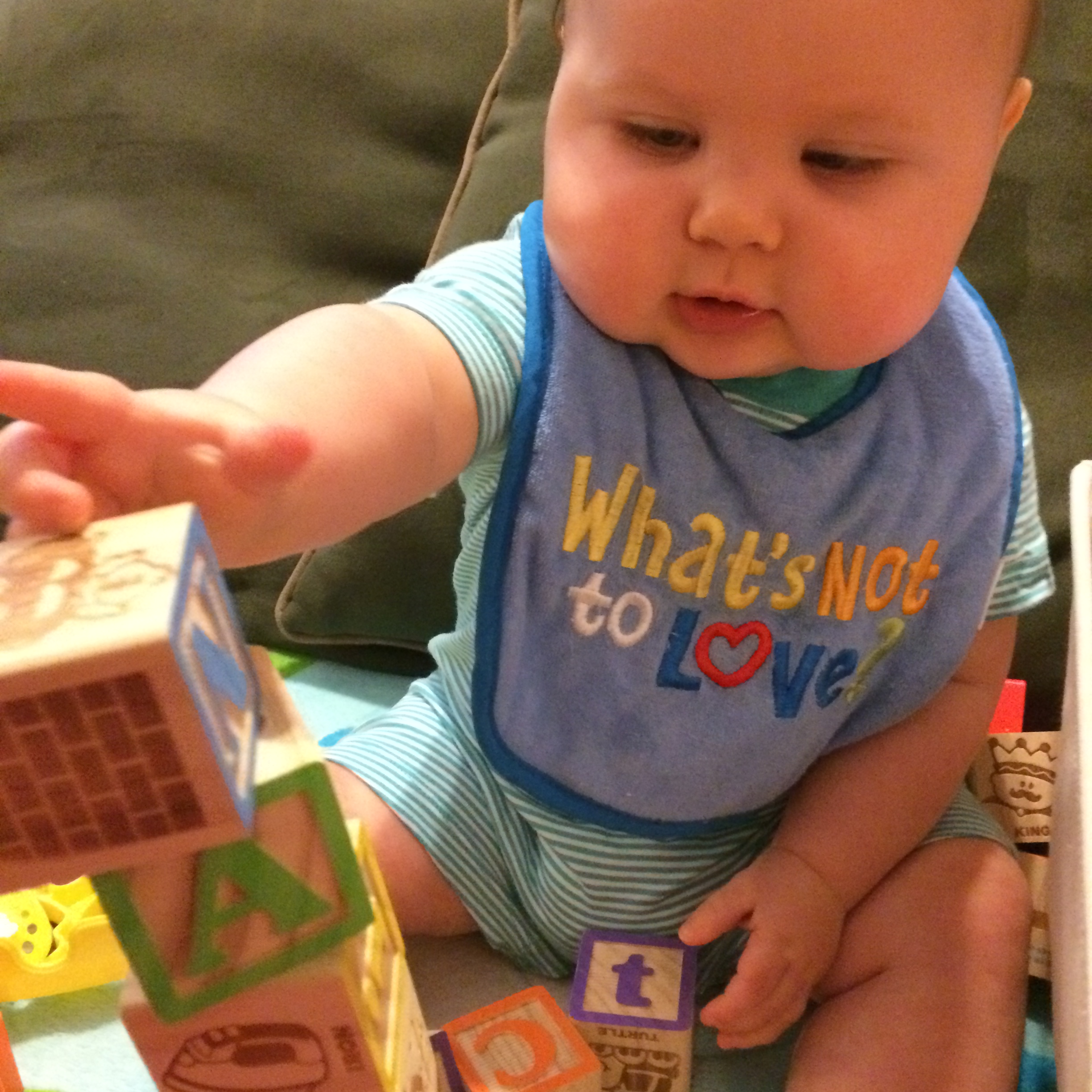 - When playing with blocks you can say “put it in the box” and he will do it. He seems to understand “in” and “out” of things.