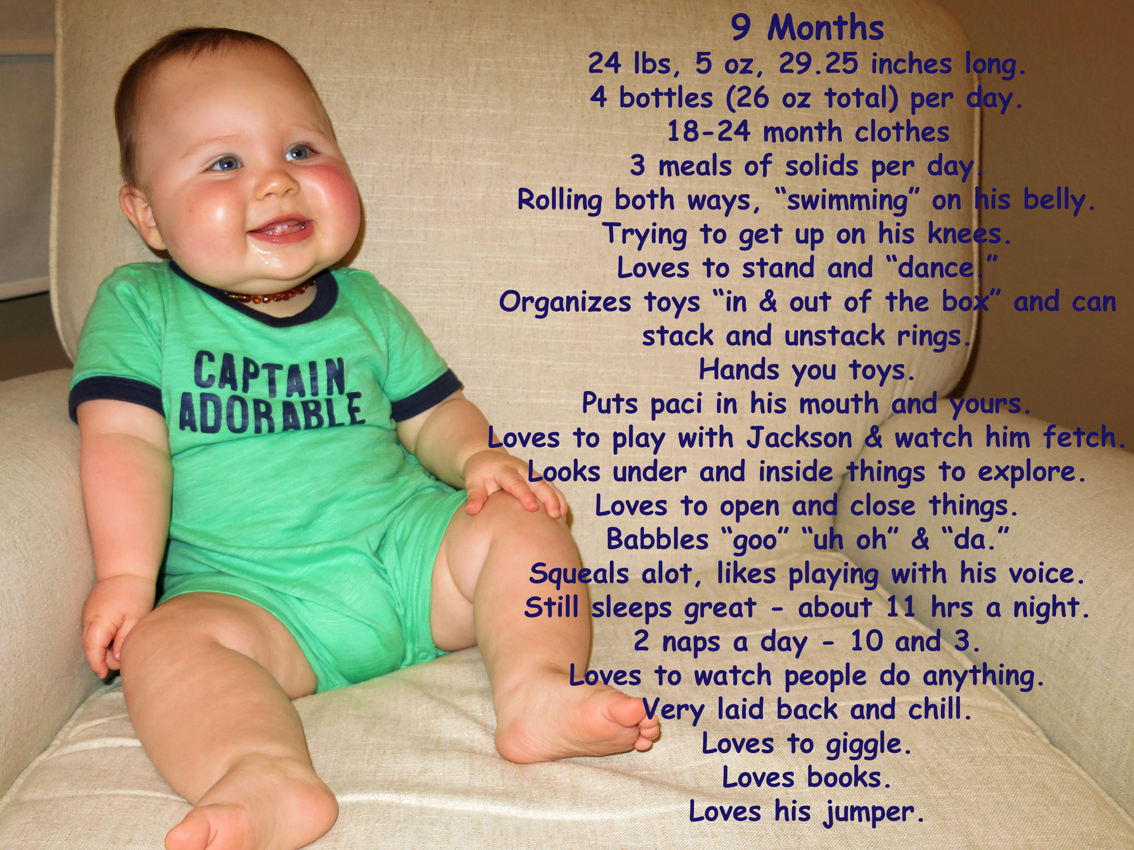 - He also now loves to watch Jackson play fetch and gets the concept that you throw the toy, Jackson goes and gets it and brings it back, and you throw it again. For instance, if we aren’t paying attention and Jackson drops the toy Ritter will squeal or fuss until we pick it up and throw it. We also have started putting the toy in his hand and helping him “throw” it and it’s the cutest thing. He watches Jackson take off and giggles so much. The funny thing is that if we aren’t watching, Jackson will sometimes bring the toy and drop it in front of Ritter in the high chair or the jumper – Jackson doesn’t get that Ritter can’t really throw it yet.