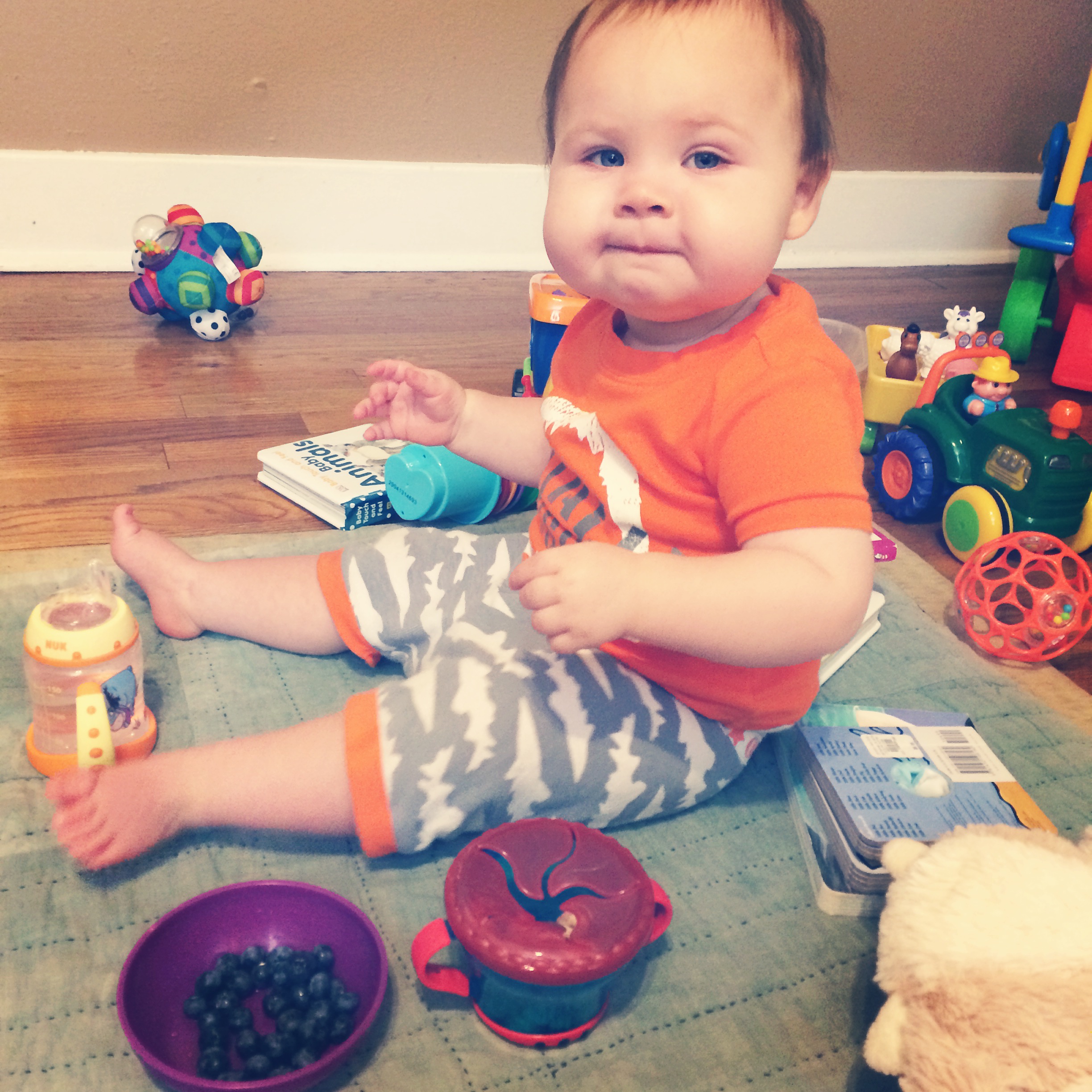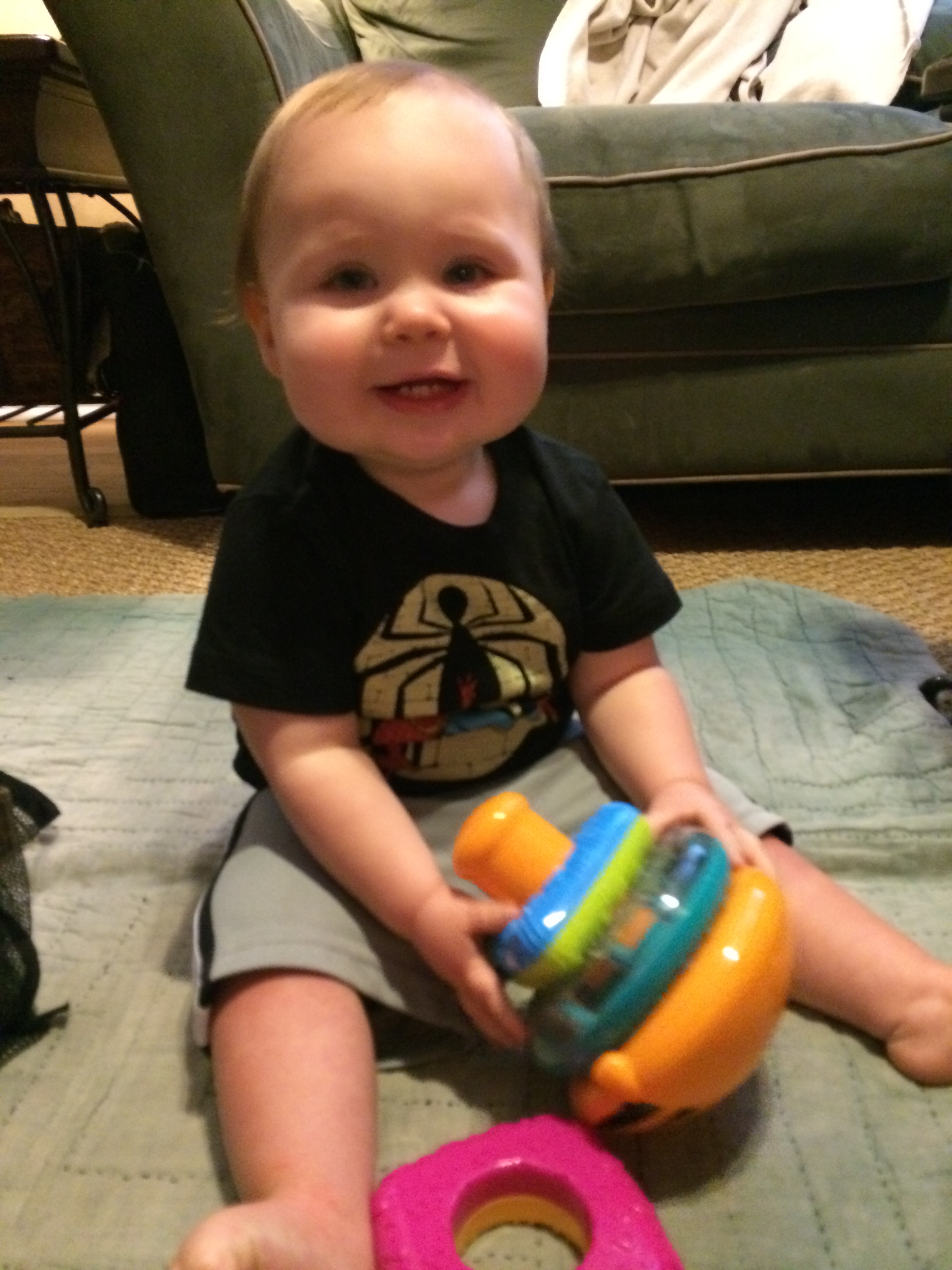 Ritter still isn’t walking on his own but he’s a pro at walking holding onto something.  He walks all around the coffee table, along the couch, etc holding on with just 1 hand. And he’s FAST.  He will also now walk holding my hand which is so awesome.  But he’s not ready to take the leap on his own yet.  I’ve caught him standing and balancing by himself without holding on to anything a couple of times, but no steps yet.  Like everything else…he will do it when he’s ready.  I just hope he’s walking when he starts school on Nov 1st.  I will also be glad for his poor little knees to have a break.  They stay bruised up. Ritter still eats like a rock star.  His diets is mostly veggies.  Beans and nut butter for protein.  Avocado and olive oil for healthy fats.  Non dairy milk.  We do some fish and chicken but very little.  Mostly organic produce.  When he’s teething he is fussier during meal times and has less of an appetite…but otherwise he’s still eating very well. I’ve noticed that he is having a bit of stranger danger recently.  He’s always needed to warm up to new situations but after 15 minutes or so he was usually good.  However, I recently took him to the childcare room at my gym while I worked out and he pretty much cried the whole time.  However…like most things, he adjusts very fast so I think if I keep taking him on a regular basis he will warm up to it.  For example…we recently started the KinderMusic classes.  When we walked in the first class he freaked out…new place, lots of new people, a big crowd, etc.  He cried and fussed off and on for the first 15 minutes.  But after that he was crawling all over the room and saying “hi” to everyone!  We went back for our 2nd class today and he never fussed once.  Didn’t even wrinkle his brow.  He loved every second of it and even ended up in the middle of the circle dancing for everyone!  He made a friend and even shared his snack with her!!!  So…I think the first class was an adjustment because it was something new, but today he was totally fine!  I was so relieved.  It makes me feel alot better about him starting school in a month.  The first day or 2 might be rough but, like with everything else, I totally expect him to adjust quickly and be the happy boy he usually is!
