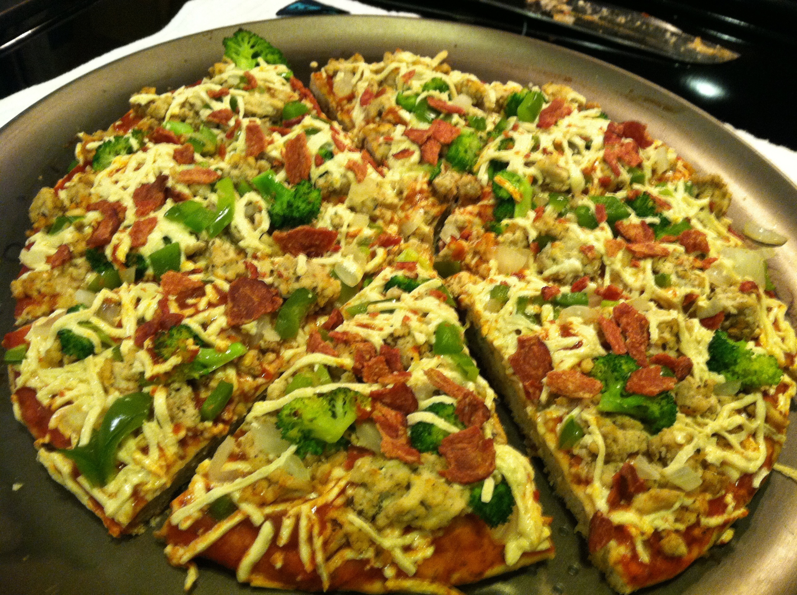 Gluten free pizza crust topped with marinara, spinach, broccoli, tomatoes, sundried tomatoes, bell peppers, vegan cheese