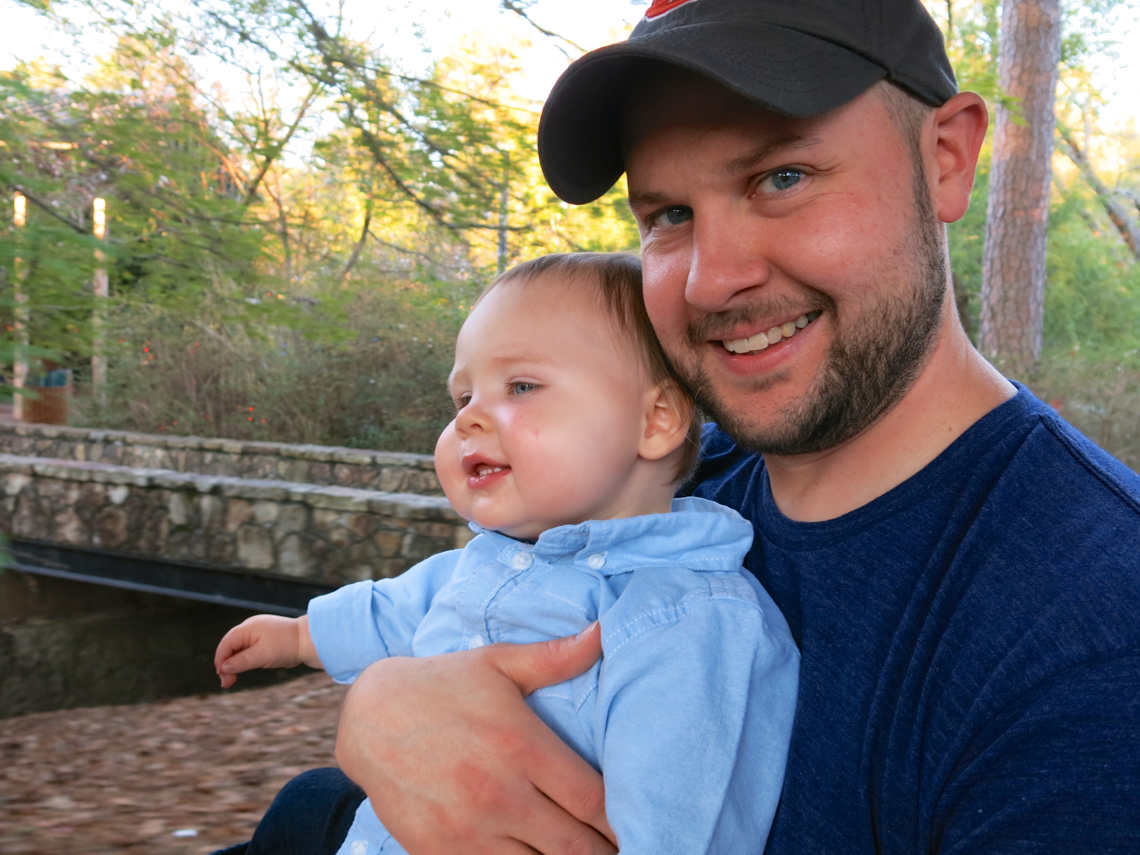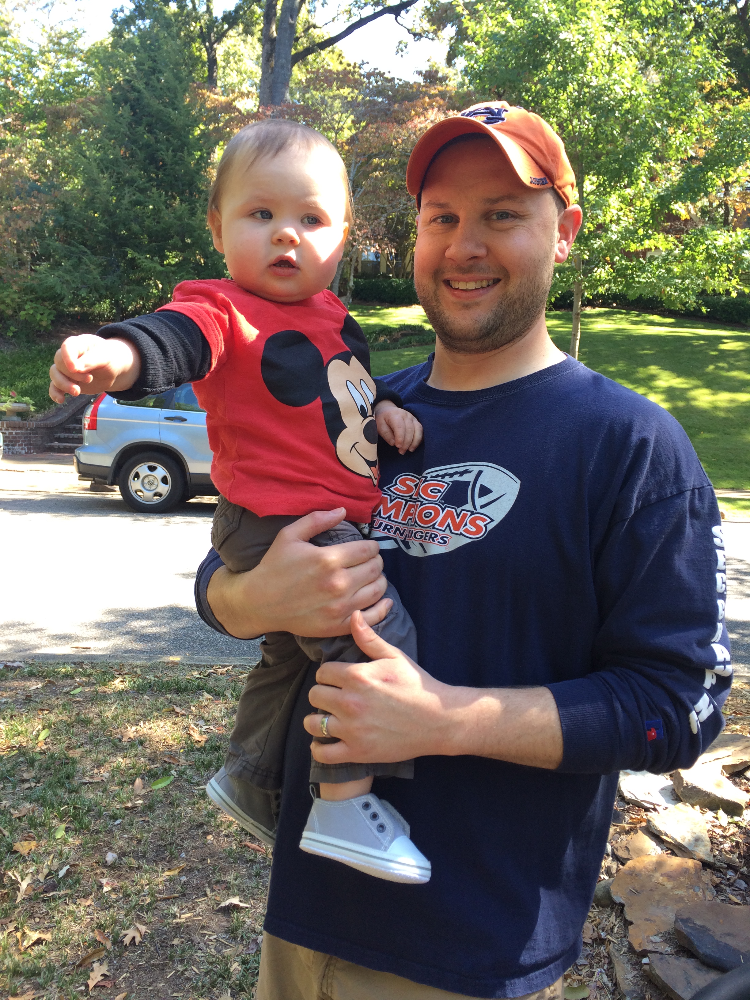 He is so funny y’all. He tries to feed his stuffed Mickey and Jackson. He tries to put on his clothes, shoes, and socks. He puts sunglasses on and takes them off over and over. He waves bye bye and it’s SO cute. He LOVES to open and close things. Right now he’s obsessed with bottles with caps. I gave him a bunch of empty vitamin bottles and those are his favorite toys right now. He takes the caps off and on over and over. He’s not really interested in drawing or coloring yet but he wants to take the crayons out of the box and put them back over and over. He’s started giving hugs, cuddles, and kisses. The absolute BEST is when he tries to make me and Eric kiss. If we are both sitting in the floor with him he will reach out and turn our heads towards each other and make us kiss. Then we both kiss him and he giggles SO much! He loves to play chase and hide and then turn around and say BOO! He is now laughing when he passes gas. I swear we didn’t encourage that! He also thinks it’s hysterical when I sneeze, blow my nose, or swiffer. Ha! No idea why. He’s also following instructions and even if he doesn’t know an exact word you use, he can infer what you mean from context…which, of course, means he’s super smart! He can also point to his toes, belly button, nose, and mouth when you ask him to. He’s also playing with his toys alot more these days – particularly cars, trucks, and trains. He will move them back and forth and try to make a little “vroom vroom” sound.