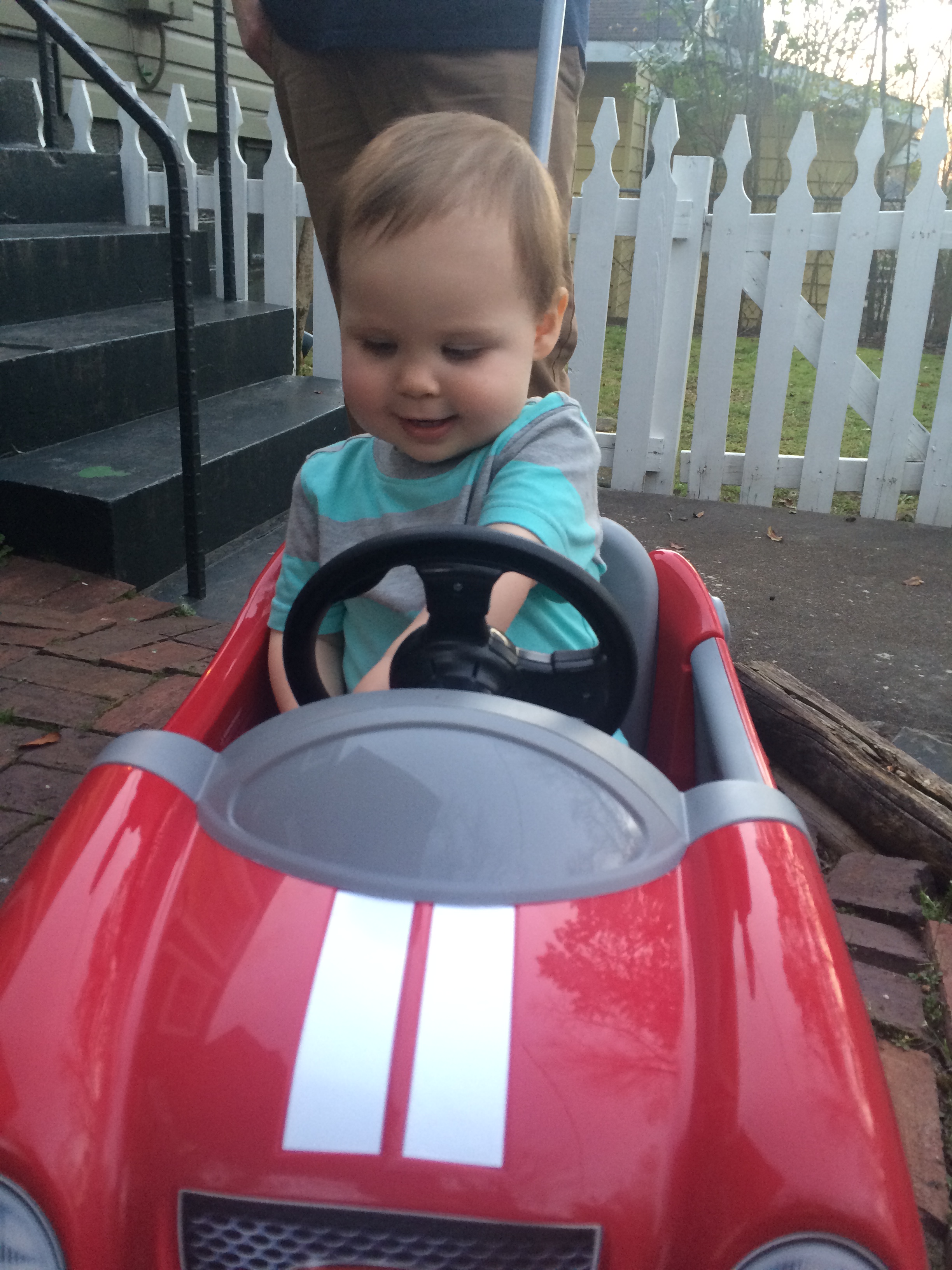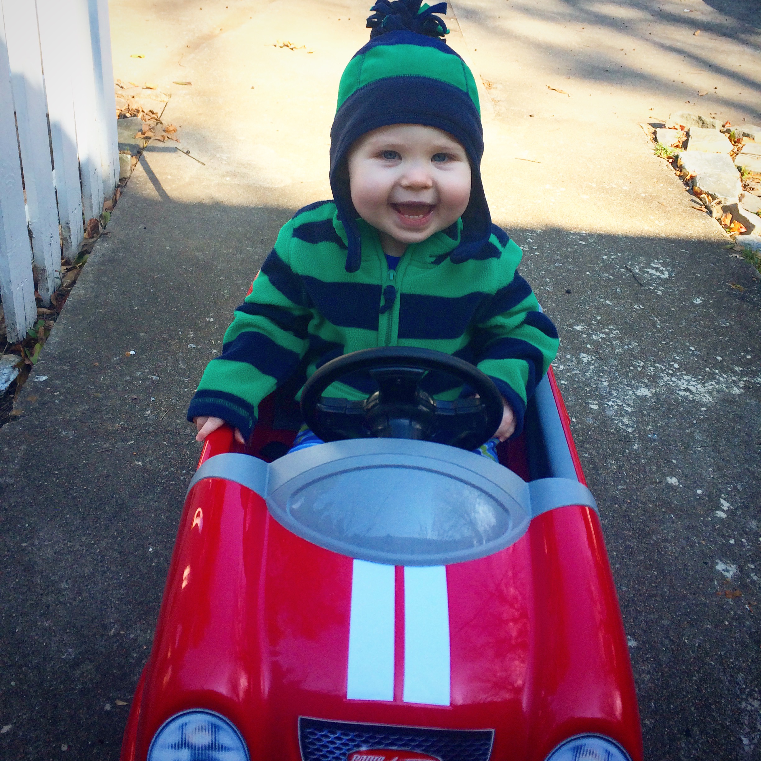 So he’s running. Full out running all over the place. He loves being outside and asks to go out constantly…especially when it’s pouring down rain outside. He goes to the door, grabs the door knob, and says “outside now pweeese!” He loves to slide and swing and ride in his little sportscar. He loves to gather things outside also. We routinely pick flowers for Daddy on fridays and Ritter wants to store it in the “pock-net” of his “hoo-hee” until daddy gets home!