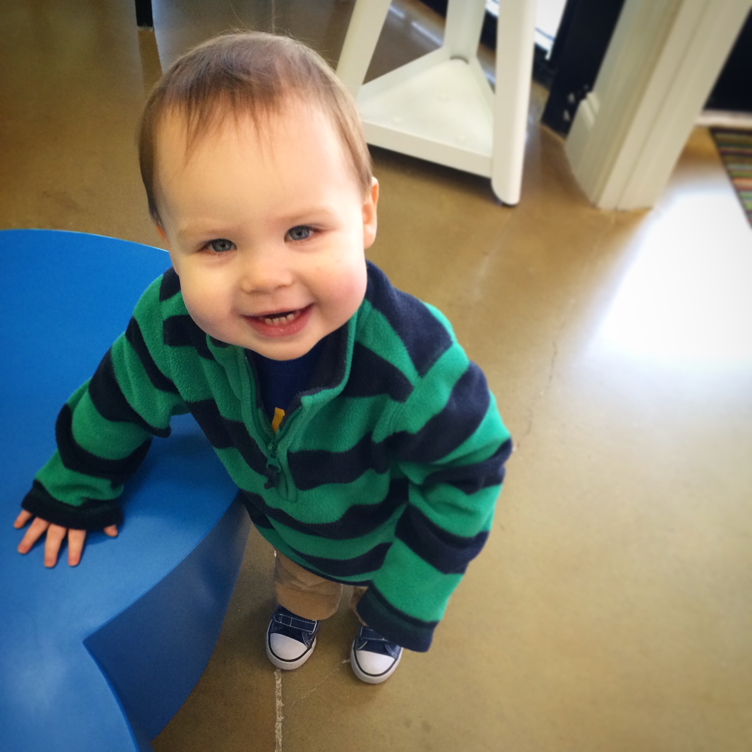 He is naming things everywhere we go. We got in the car the other day and he said “car seat.” He walks by a tree and says “tree.” When I sit down to eat he says “mama eat” and “mama’s bowl.” …It’s lots of cute little things like that..just letting you know he knows what is going on. haha. He’s learning his colors and will randomly point to something and say the color. Green seems to be his favorite. He’s also big into singing and music these days. We are constantly singing I’m a Little Teapot, If You’re Happy and You Know It, and, thanks mom, the Oscar Mayer bologna song. At the end of each song he will go “Teapot again” or “Happy again” so you will keep singing. He loves when Eric and I do all the movements…he will do the teapot handle perfectly but doesn’t do the spout yet. haha. He does love to ‘tip over’ and ‘pour out’ though. He also says “bye bye” to things/people. The other day we were leaving to go to the library and he said “bye bye Jackson” clear as day. I melted. That’s the first time he has ever spoken to Jackson other than to tell him to move. haha. A few weeks ago he started using the word “now” at the end of everything. It was kinda annoying so I kept redirecting him to use “please.” Now everything ends in “now please” …like “eat eat now please?” It’s precious. Here is a video from when he started with the “now” thing…