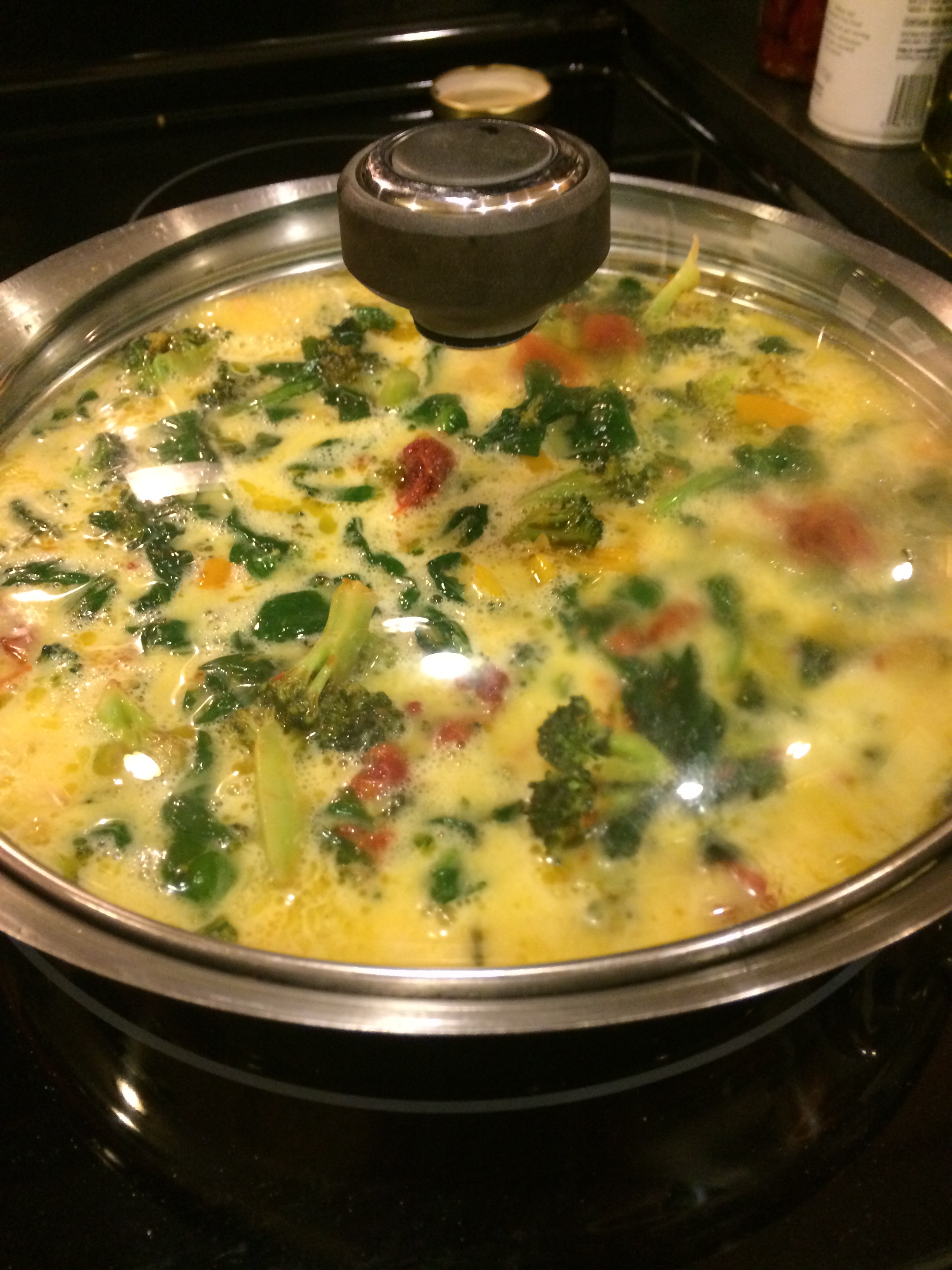 2.  Prepare 8-9 eggs by whisking well- using a combination of whole eggs and whites if you prefer – possibly add a dash of almond milk and sprinkle of cheese for extra creaminess.