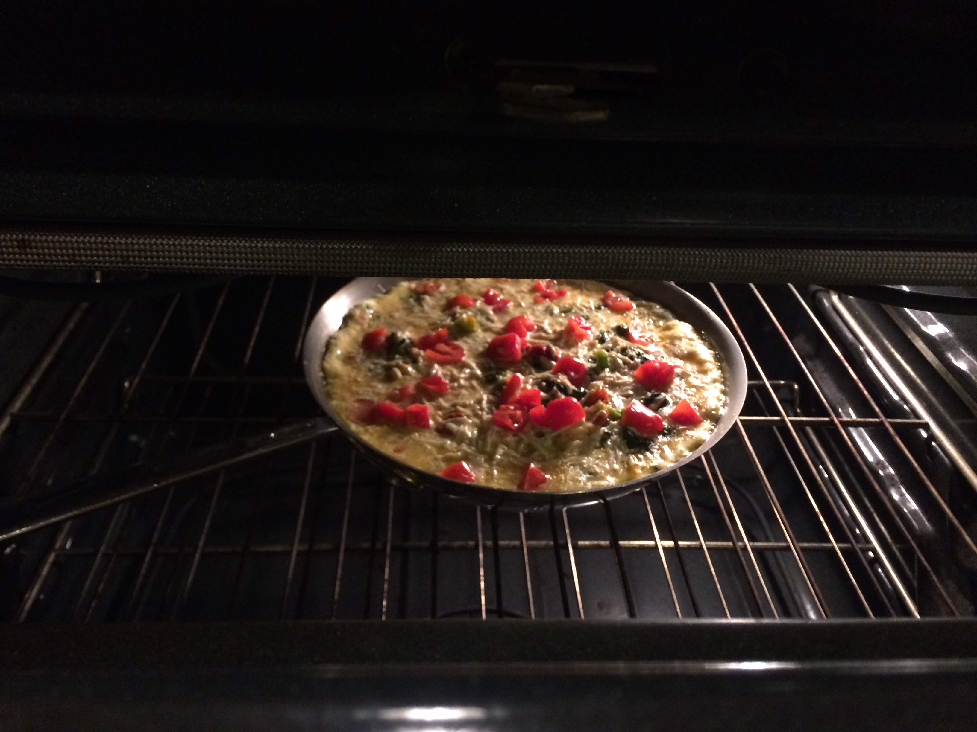 10.  When about halfway set (you can press with a fork and feel some firmness starting to form – still slightly watery on top), top frittata with additional cheese/tomatoes and put skillet in the oven.