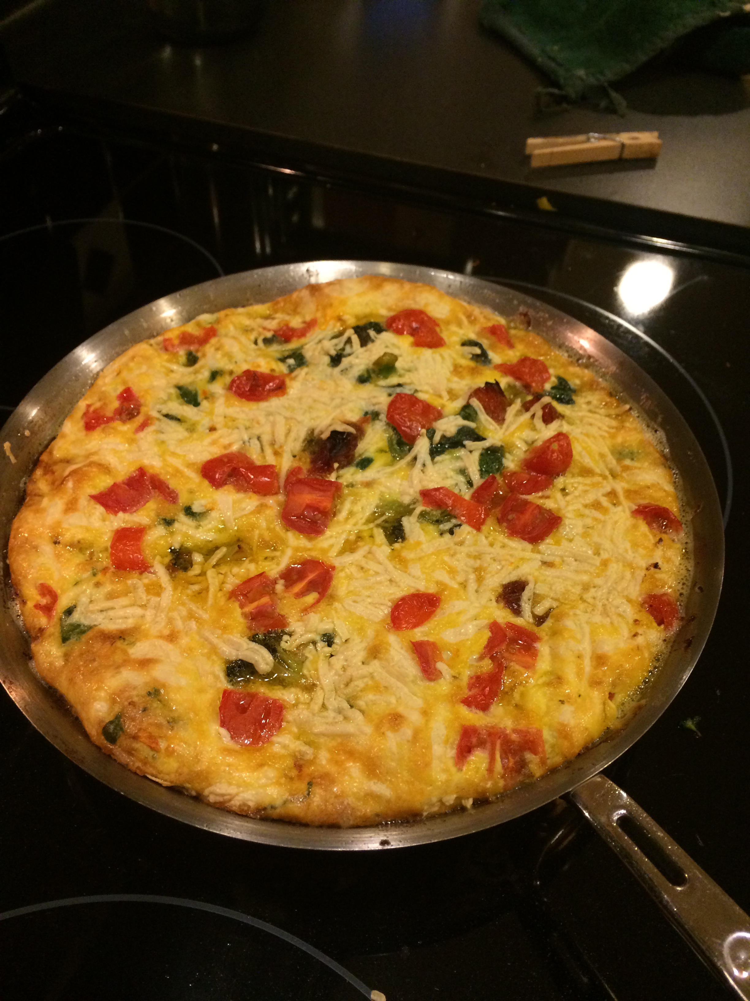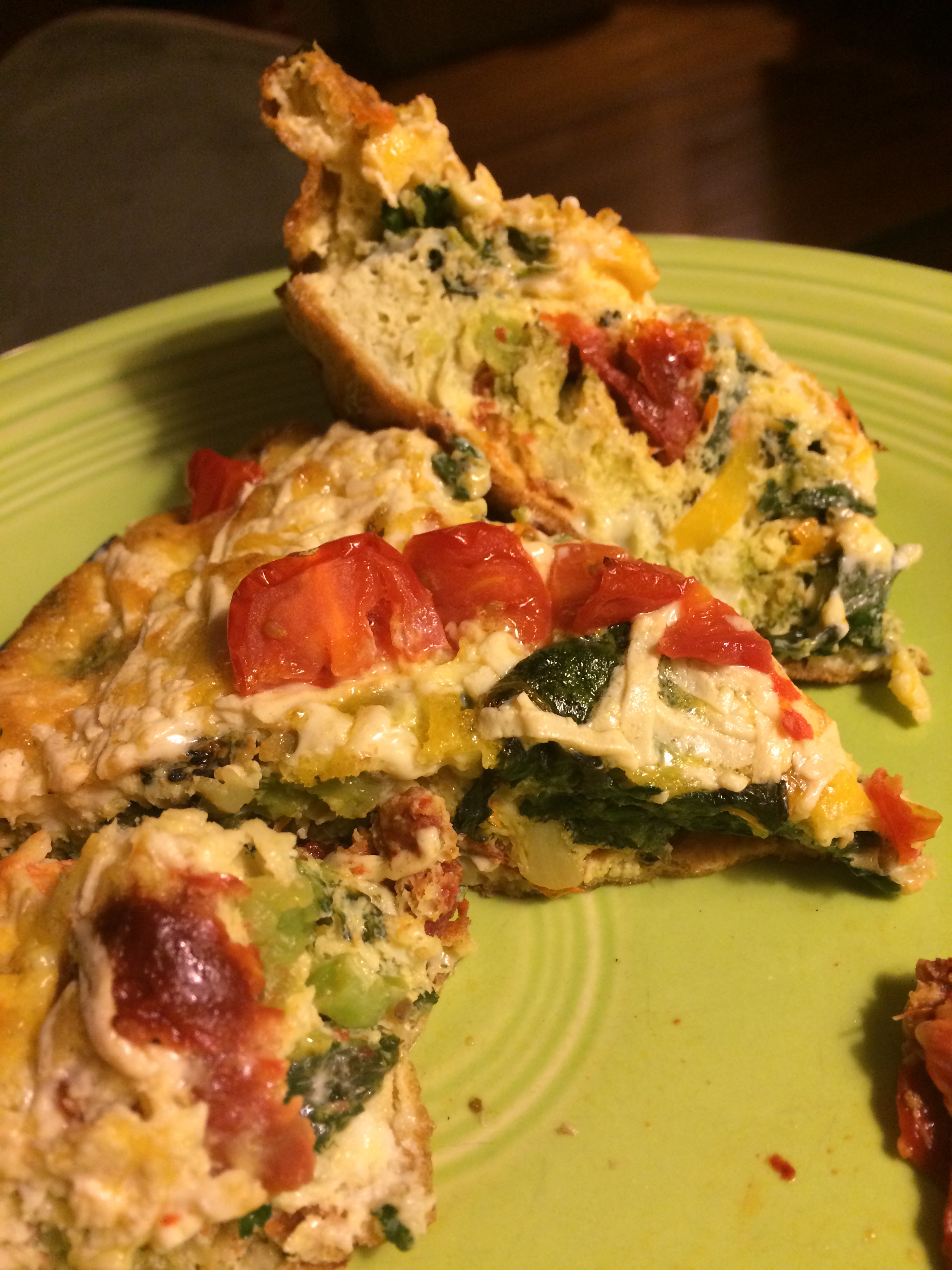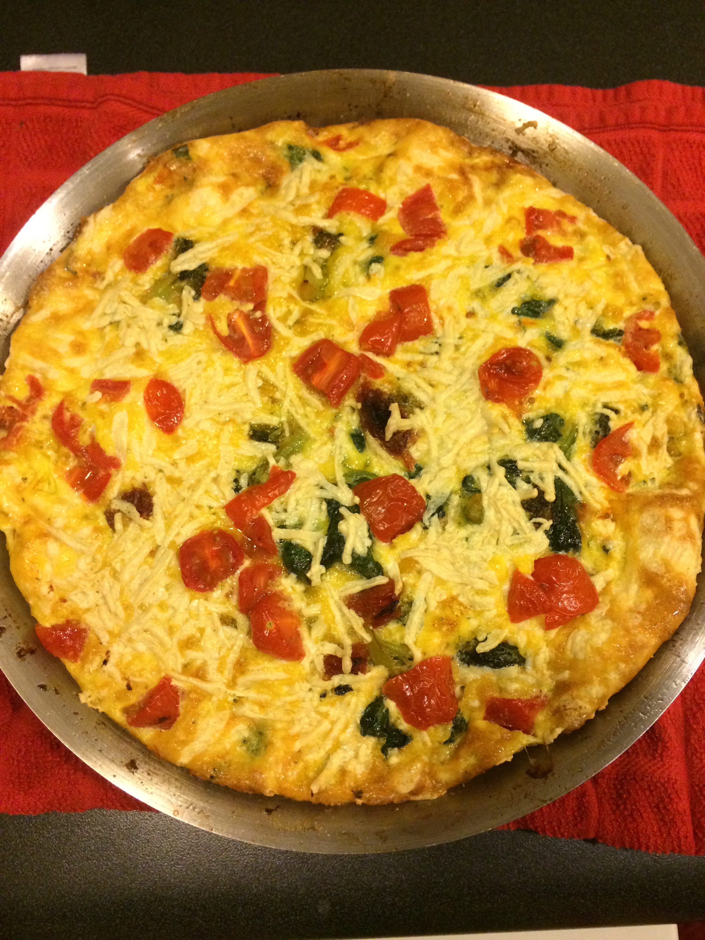 A frittata is quite possibly the most perfect, easy, gluten/grain free meal. Tons of veggies and protein …and who doesn’t love a one pot dish?! Throw in anything you want…this one has sweet peppers, broccoli, spinach, sundried tomatoes…and is topped with fresh tomatoes. You can add sausage, bacon, chicken, or any meat or veggie. For those that don’t know…a frittata is a crustless quiche. Every time I make one of these I go…”why don’t I make these more often?!” So easy and yummy!
