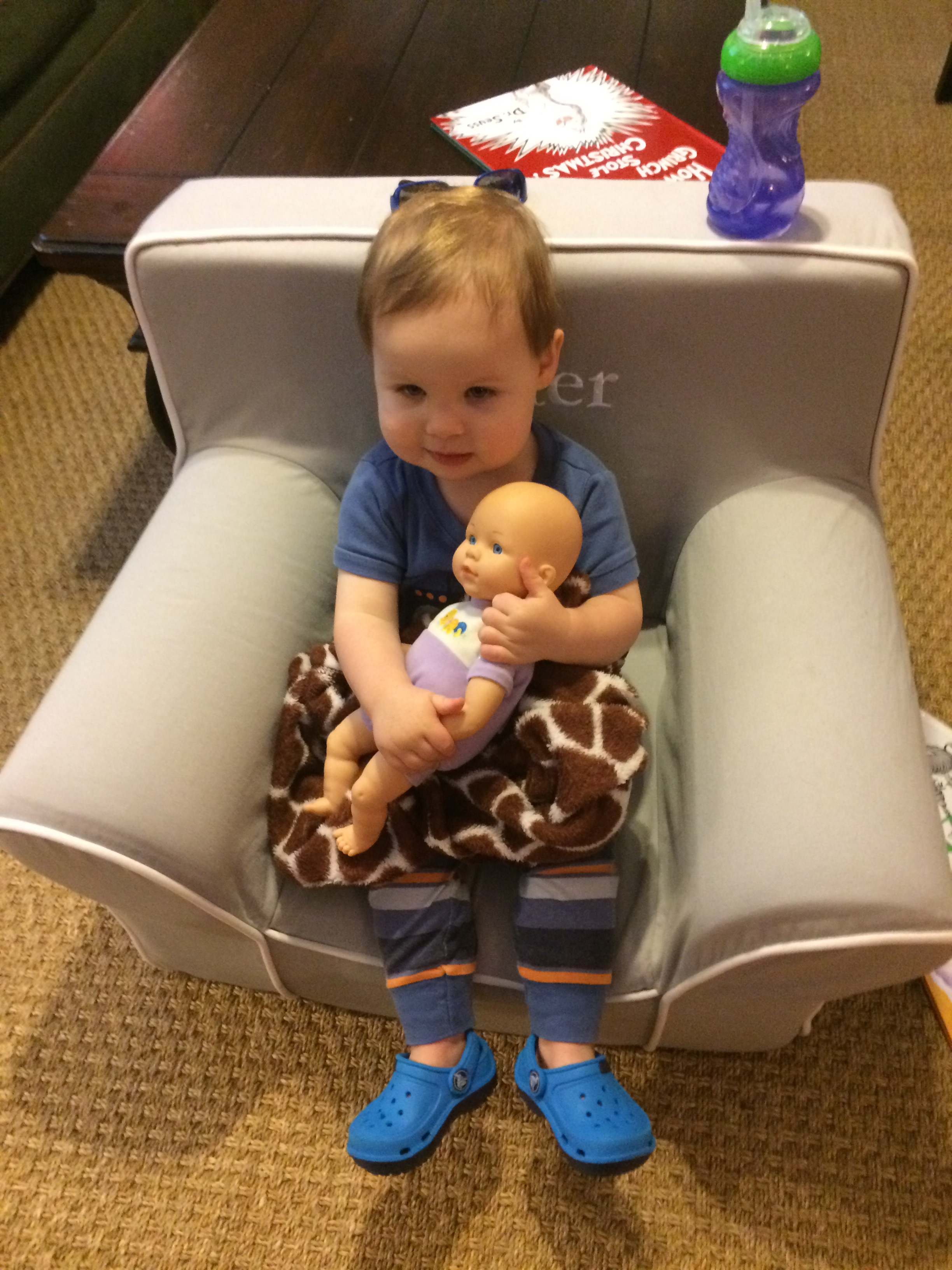 But it worked. When Ritter arrived Jackson was calm and wasn’t at all freaked out by the presence of this new little thing. So anyway, that doll has been in the bottom of Ritter’s toy bin for 2 years. He’s all of a sudden very interested in it. He carries it around and wants to put a diaper on it, dress it, etc. He’ll say “baby needs a blanket mama!” or “baby needs a nap mama!” It’s so sweet. I think he sees the girls at school playing with dolls and since he’s very nurturing naturally he’s taken to the concept of caring for one himself. He asks for the baby to sleep with him. It’s so sweet.