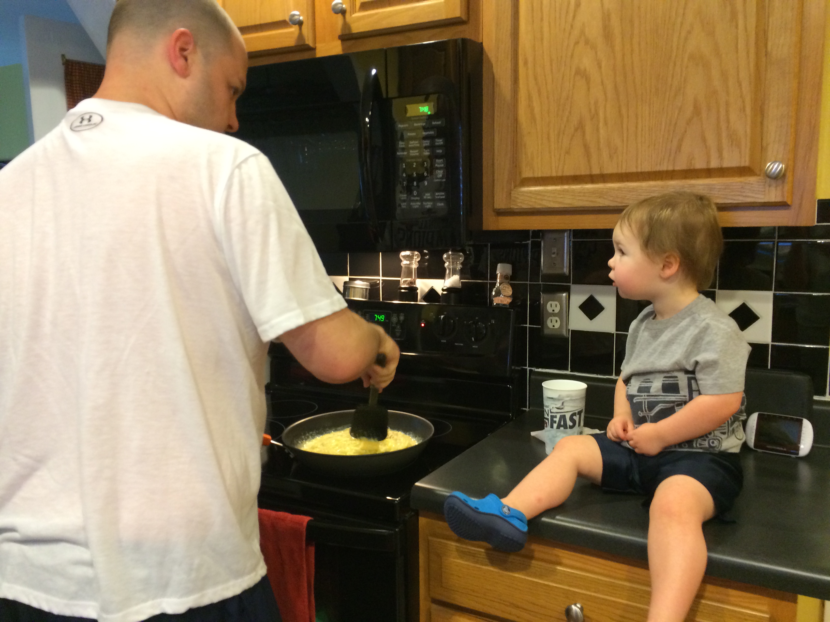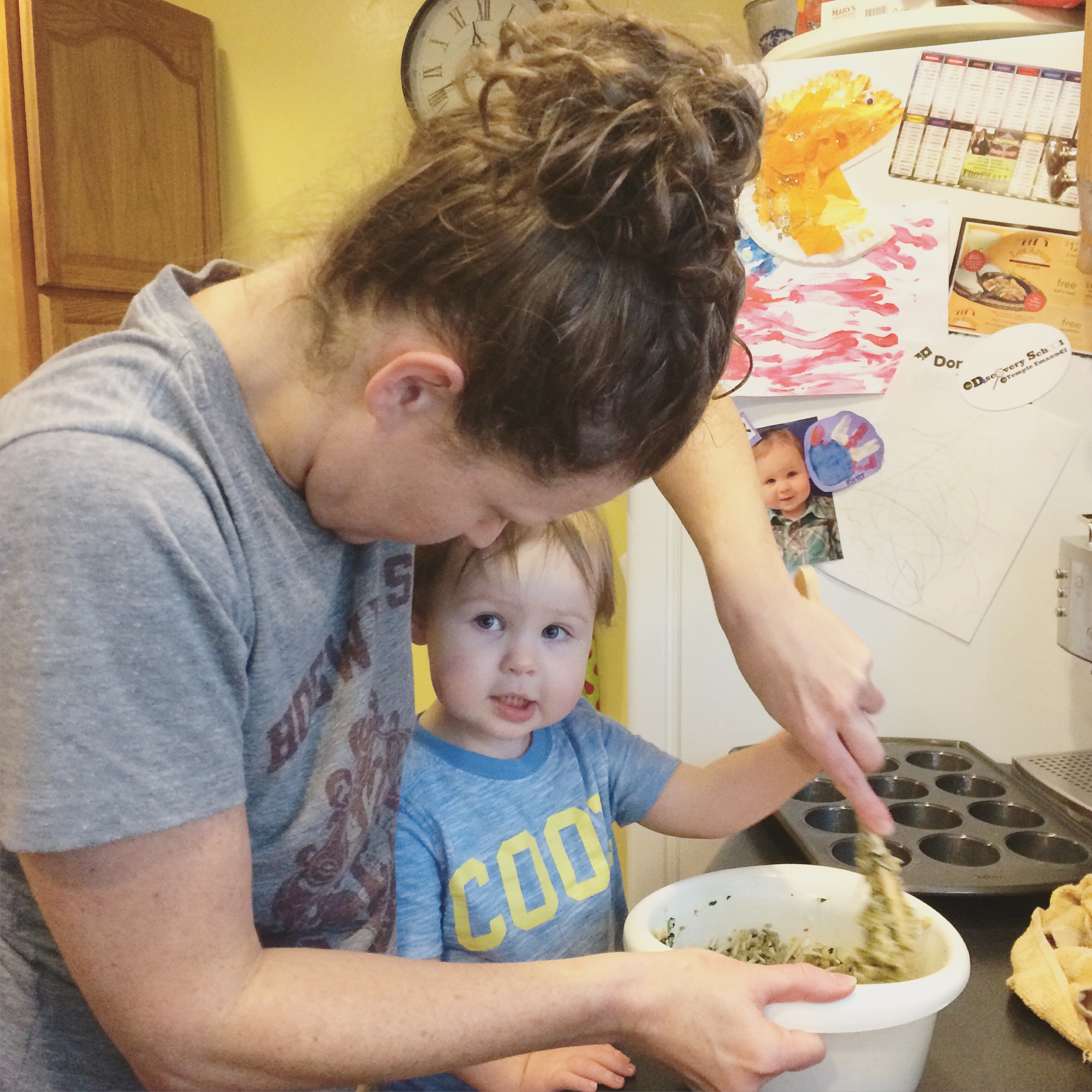 Ritter’s play is increasingly imaginative. Anything and everything can be a phone, or stove, or guitar. For example…the other night we stopped to pick up takeout at Makario’s. They have one of those gumball/candy dispensers by the counter. As I was paying for food Ritter went over to it. When I walked over to him I said “whatcha doing” and he said “cooking beans mama!” He was pretending to take the “beans” out of the machine and put them in a bowl on the little shelf. Then he was carrying the “bowl” over to an empty table where he was sitting it down and serving the imaginary people there. He was just a talking to himself “here are your beans, and here are your beans…” I didn’t want to make him stop because it was so fun to watch his little imagination go. But we had to get home with our takeout. ha. But that’s just one example of how crazy his imagination is. He “cooks” for us ALL the time. That’s his favorite thing to play. And it’s not surprising since he sees me cook constantly. My mom wanted to buy him one of those huge play kitchens that we don’t have any room for in our tiny house… but Ritter doesn’t need it. He makes a “kitchen” out of anything!