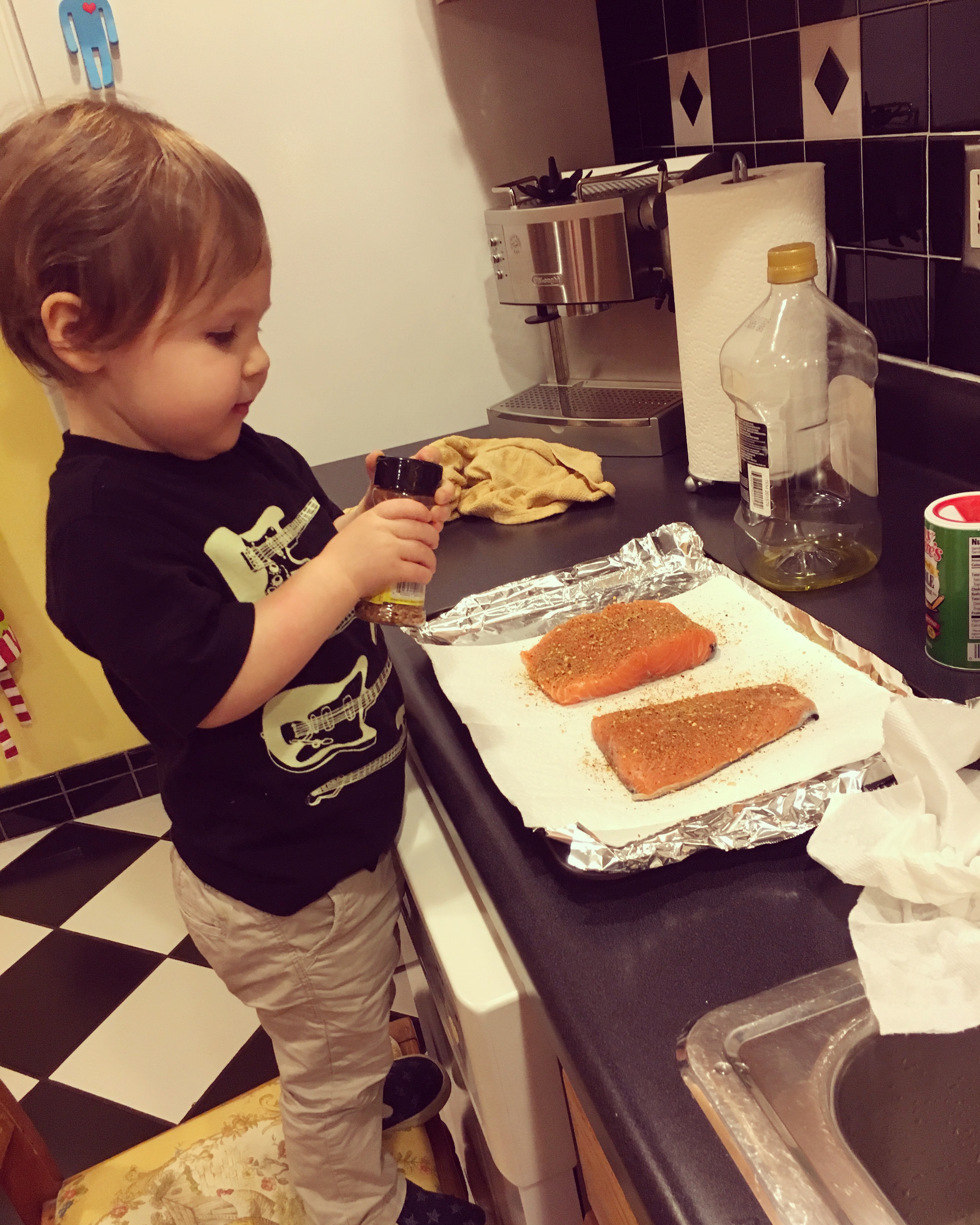 Great example of following directions… teaching him how to shake the spices on the fish and making sure not to touch it. He is such a good helper! –