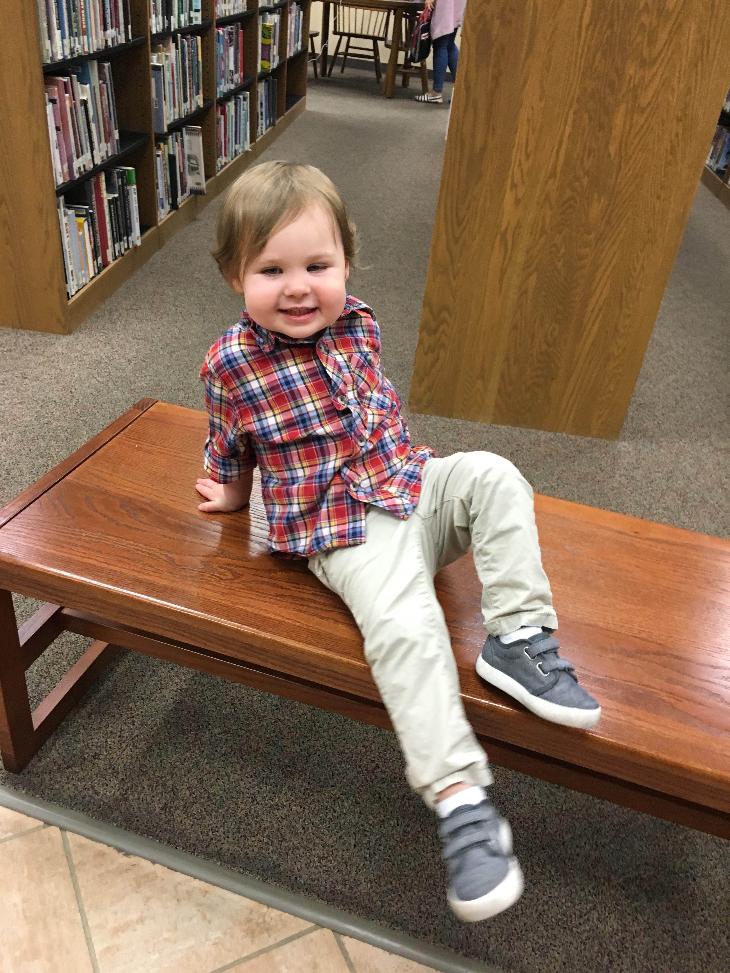 Ritter’s bench at the library where he perches and watches me check out all our books each week. Then when I’m done, because he doesn’t want to leave, he turns to the shelf behind him and ALWAYS grabs a book about the emancipation proclamation (same book each time) and insists that he has to read it before we can go home. –